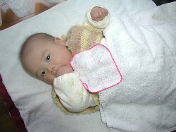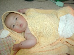 ▲葵は、額が禿げ上がったおじさん、もしくはお地蔵さんって感じ。(^^; ▲お風呂上り。タオルにくるまれて気持ちいい。(娘の名前の「名付け」の過程を振り返るシリーズです。以前のepisodeを遡る時は、「カテゴリ」よりご覧ください。)★再び浮上してきた「透」の漢字★「葵」編、第2回目です。前回は、「くるみ」「真綾(まあや)」が姓名判断で、良くなかったことは書きました。たとえば「真綾」の姓名判断でみると、「家庭や社会に押しつぶされやすいでしょう」と書かれていました。そんなこと書かれたら「え?まじで?そうなの?」と、ちょっと、名付けるのをためらってしまいますよね?ただ、「真綾」については、漢字自体が、気に入っていたのと、「まあや」って、けっこうかわいいかな、ということで、最終候補まで残すことになります。そんななか、再び浮上してきたのが、上の娘の名づけの時に考えていた「透」を使った名前。そもそも、私自身としては、上の娘に「透萌(ともえ)」と名付けたのだから、今度生まれてくる子も、「透萌」に関連した名前が、いいんじゃないの?と思っていました。つまり、個人的に好きな「透」という字を含めて名付ければ、共通するものがあっていいのではないだろうか、と。それで、上の娘の名付けの時に考えていた「透」のつく名前を、再び引っ張りだしてきました。ちょうどその頃だったでしょうか、お腹のなかの赤ちゃんは、女の子ということが分かりました。これで、女の子の名前に集中することができます。「透」のつく名前で、比較的、私が気に入っていた名前は、「万透香(まどか)」「万透葉(まどは)」「光透葉(ことは)」などでしょうか…。普通は、読めないし、今見ると、凝りすぎのの名前だなあと、思いますね。(^^;ただ、個人的には、ひそかに、今回も「透」のつく名前がいいと思っていましたし、自分の中であたためていた「最有力候補」が、実は、「万透香(まどか)」でした!!★「万透香(まどか)」=「円(まどか)」★なぜ、「万透香」が、個人的に気に入っていたのか?ひとつは、先の述べたように、上の娘「透萌(ともえ)」との「透」の共通性。ふたつめに、漢字から受けるイメージが、何となくいいな、と思ったこと。「万透香」=「すべてのものを透かして、降りそそぐ香り?」まあ、よく分かりませんが(^^;、感覚的に、「広がり」と「清純さ」を持ったイメージがあるかなと感じていました。そして、最後に「音」の「まどか」という言葉に、惹かれるものがありました。つまり、「音に返す」です。けんたま様の「コトタマワールド」で、述べられています、「音に返す」をすると、また新たな繋がりが見えてきます。●「万透香(まどか)」=「まどか」=「円」「まどか」は「円」に繋がり、「円」は「えん」であり「○」である、さらに「縁」に繋がります。イメージとしては、この世界の「すべての循環」に繋がっています。「円」=「○」が、一筆で描けるように、「円」=「まどか」とは、「始め」と「終わり」まで、すべてにおいて関わってきます。そして、『飛鳥昭雄ミステリー大全2』(飛鳥昭雄・工学社)によりますと、「円」=「鳥居」であると!確かに良く見ると、「円」は実際の「鳥居」そのものの形です。さらに同書をみてみますと、「鳥居」=「円」=「太陽」をも象徴します。「太陽」の象徴は、「日本」であり、その日本の通貨は「円」です。すべてが繋がってきます。そういったことも含めた「万透香(まどか)」であり、いいかなあ、と。★運命は、儚く消えゆく「香り」となる…★はっきり言いまして、自分の中では、「万透香(まどか)」は、その当時、おそらく80%くらいの比重で、付けたかった名前でした。そして、満を持して、妻にいいます。「万透香(まどか)は、どうかな?」と。すると、予想もしない答えが返ってきました!!妻いわく、「(私の家の)隣のこどもさんが「円(まどか)」ちゃんなので、ダメ!!」と。「え?なんで? 別に同じ「まどか」でも、漢字が違うのだから、いいじゃないの」と私。妻いわく、「まどか!!」と「大きな声で叱れないじゃないの!!」ということです。「ガビーン!!」(死語ですね(^^;)まあ、ちょっとオーバーに書きましたが、でもこんな会話が交わされました。はっきり言って、そういう理由で却下されるとは思いもよりませんでした。まさに、驚異のどんでん返し。自分にとっては、全く予想外の答えが返ってきました。非常に、現実的といいますか、生活感覚に密着した、妻にとっては、確かにもっともな理由で、却下されてしまいました。(^^;密かにあたためてきただけに、これは、ややショックを受けました…。こうして、名付けは、振り出しに戻る事になりました。人気blogランキング登録しました。おもしろいと思ったら、クリックしていただけるとうれしいです。今回の順位は?では、ということで、個人的に、いいかな、と考えていたのが、「まな」のつく名前。「まな」「まなか」など。こ