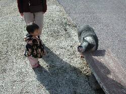 ▲葵:笑っています。珍しいんですよ。 ▲葵:しまじろうとツーショット。おにぎりですね。(^^;(娘の名前の「名付け」の過程を振り返るシリーズです。以前のepisodeを遡る時は、「カテゴリ」よりご覧ください。)★4つの候補の狭間に浮かび上がった名前★2004年7月31日に生まれることになる、赤ちゃんの名付けの過程。6月後半から7月始め頃だったでしょうか、候補は4つに絞られました。●「真綾(まあや)」●「光透葉(ことは)」●「葵(あおい)」●「蒼依(あおい)」しかし・・・前回の最後の部分を、引用します。ーーーーーーーーーーーーーーーーーーーーーーーーーーーーーーーーーーそして、この後、4つの候補を中心に名付けが、なされていくはずだったのですが、7月を過ぎた頃だったでしょうか、唐突に、別のある名前が自分の中に浮かび上がってきました…。ーーーーーーーーーーーーーーーーーーーーーーーーーーーーーーーーーー どういう名前が、浮かんできたのか…。それが、「しおん」でした。★「シオン」とは何か★なぜ「しおん」なのか?7月といえば、京都では日本三大祭のひとつ、祇園祭でにぎわう時期です。クライマックスを迎えるのが、7月17日に行われる「山鉾巡行」です。この「山鉾巡行」こそ、祇園祭の真意を集約したものである、といえるのでしょうし、このルーツも意外なところへと繋がっていきます。一言でいえば、「山鉾巡行」は、「聖書」のある有名な物語へと繋がっていく!!と。これについては、迷走を続けている(^^;「蘇民将来」と「過ぎ越しの祭り」シリーズでも、いずれ、とりあげてみたいと思います。ここでは、さらっと見ていきます。この祇園祭の「ギオン」という言葉の語源をいていくと、意外なところへ繋がっていきます。これも、先のシリーズで取り上げているので、結論だけを言います。すなわち、「ギオン」とは「シオン」からきている!と。ーーーーーーーーーーーーーーーーーーーーーーーーーーーーーーーーーー●「シオン」=「Zion」=「ジオン」=「ギオン」=「祇園」●「紫苑(しおん)=きく科の多年草」=「紫苑菊」=「十六菊花紋」=「皇室の紋章」ーーーーーーーーーーーーーーーーーーーーーーーーーーーーーーーーーーでは、「シオン」とは何か?ーーーーーーーーーーーーーーーーーーーーーーーーーーーーーーーーーー●「シオン」(Zion) イスラエルの東部、エルサレムにある丘。ダビデ王の墓があり、ユダヤ教の聖地。また、エルサレムの町全体をさす。ーーーーーーーーーーーーーーーーーーーーーーーーーーーーーーーーーー「祇園祭り」は「シオン祭り」となり、古代イスラエルと日本の繋がりを示唆しています。と同時に、「祇園祭り」(=「シオン祭り」)は、「7月17日」がクライマックスであり、象徴である、と。ですから、こういうことが言えるかなと。7月17日は、「シオン」(祇園祭)の象徴である!と。そこで、私は思いついたわけです。単純なんですが…。★「賭け」に勝つか負けるか★「7月17日」に、赤ちゃんが、もし生まれてきたら、「しおん」と名付けよう!!と(^^;妻にも、そう宣言しました。妻は、「はあ…? いきなり、何をわけの分からないことを言い出すの??」という顔をしていたことは言うまでもありません(^^;生まれてくる赤ちゃんの予定日は、7月31日でした。結果的に言えば、赤ちゃんは、予定日きっちりに生まれてきた訳ですが、むしろ、きっちり生まれてくる方が少ないといいます。たいていは、予定日の前後に生まれてくるものです。ですから、7月17日に生まれてくる可能性は、十分にあったわけです。その時は、「紫音」「紫遠」など、候補がありました。とにかく、もし本当にその日に生まれたら「しおん」という音にすることは、決めました。一種の「賭け」です!!子どもの名付けで、「賭け」するなんて、遊びじゃないんだからあ、と軽蔑されそうですが、もしこれで、7月17日に生まれてきたときは、それは運命だろうなどと、悟ったようなことを考えていました。★そして迎えた運命の日★7月17日に生まれたら「しおん」にする、と宣言してから、刻一刻と運命の日は近づいてきます。そして、7月17日の日、祇園祭のクライマックス、山鉾巡行が行われる日を迎えました。その日は、何だか会社に行ってても、そわそわしていたような気がします。もしかして、本当に生まれちゃうんじゃないだろうか?と。家に帰って、「どう?」と聞いてみましたが、大丈夫な様子。7月17日の夜、時計の針は、十二時をまもなく迎えるという時になり、妻に陣痛が・・・くる様子も、全然なく、淡々と、悔しいくらい平穏無事に、時は十二時を回っていきました…。(T_T)いや、別に泣くことでもないんですが…。こうして、あえなく、「しおん」は、立ち消えになってしまいました。ひとときの夢を見せていただいたような、そんなすがすがしさを感じながら。そして、再び大詰めを迎えた名付けは、4つの候補に戻ることになります。 