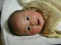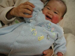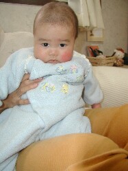 ▲葵:とろんとした目つきがおもしろい。 ▲なんだあ、この顔は。パンパンの顔です。(^^;(娘の名前の「名付け」の過程を振り返るシリーズです。以前のepisodeを遡る時は、「カテゴリ」よりご覧ください。)★どこからともなく浮上してきた「葵」★「まどか」「まなか(まな)」が、隣と裏の娘さんと一緒で却下。そして、前回は、好きな女優の「つぐみ」の名前も(^^;、姓名判断が悪くて、ホッとしたような、ちょっと残念だったような…、いずれにしても却下でした。そして、それ以上、新たな名前を考える気力もなく(^^;、5月から6月中にかけては、特に進展がなかったように思います。赤ちゃんが生まれたのが、2004年7月31日ですから、もうある程度は決めておかなくては、というのもありました。結局は「葵」になったわけですが、思うに、「葵」というのは、いったい、いつごろ候補にあがってきたのだろうか…、ということです。正確には思い出せません。上の娘、透萌(ともえ)の時の候補の名前のひとつ、であったのですが、私にとっては、ただそれだけで、はっきり言って、「葵」にするつもりは、なかったということです。なぜ、その気がなかったのか?ひとつは、「葵」という名が、非常に人気のある名前だからです。事実、2004年の名付けランキングでは、第8位にランクインしています。だから、ひねくれものの私(`ヘ`)としては、つけるはずのない名前です。ただ、妻が、「あおい」ちゃんはどう?と言ってきたのが、きっかけであったと思います。これには、理由がありますが、もう少し先で、見てみます。さらに、後で、もしかして、あの時「葵」が示唆されていたのではないか、ということも、映画『黄泉がえり』の鑑賞で、気がつきました。これについても、後日「シンクロニシティ」シリーズで、見たいと思います。いずれにしても、その頃「葵」という名前も、候補のひとつに加えておこうか、という感じでした。私は、その時は、この名前全然乗り気ではありませんでした。(^^;そうこうしているうちに、7月も過ぎ、候補はある程度絞っておこうということで、最終的に「4つ」にしました。いよいよ、名付けの過程も、最終章へ突入!!ほんとかよ…という声が聞こえてきそうですが…。(^^;★絞られた最終の4つの名前★ざっと、4つの候補について、みたいと思います。●「真綾(まあや)」声優でもあり、歌手としても活躍している、坂本真綾さんの「真綾」を拝借。姓名判断は良くなかったのですが、漢字が気に入っていたのと、「まあや」という響きが、かわいらしくて、ふたりとも、未練があったため、最終候補に残しました。詳しくはこちらのエピソード→赤ちゃんの名付け・episode5●「光透葉(ことは)」タイトルの「光透波(ことは)」の「波」を「葉」にした名前。ハンドルネイムにも使っている、個人的に愛着のある名前です。上の娘の透萌(ともえ)の名付けの時、9割以上「光透波」になる予定だった事は、先の→「赤ちゃんの名付け・episode3」と「eisode4」で書きました。今回もしつこく入れることにしました。よほど、しつこい男です。(^^;●「葵(あおい)」これについては、先にも述べましたように、私はあまり乗り気ではなかったのですが、いくつかのシンクロニシティなどもあり、また、妻から言ってきた名前だったので、候補に加えました。結果的に、この名前になるのですが…。●「蒼依(あおい)」「あおい」の「葵」とは別のバージョン。「葵」が出てきた時、「葵」ではあまりにメジャーなので、もうちょっと別の漢字はないだろうか、ということで、ひねくれものの私が、苦肉の策で考えて、無理やり加えた名前(^^;個人的には「蒼」という字は、何となく好きな字だったので。妻には「蒼」が男の子みたいということで不評でした…。そして、この後、4つの候補を中心に名付けが、なされていくはずだったのですが、7月を過ぎた頃だったでしょうか、唐突に、別のある名前が自分の中に浮かび上がってきました…。 ▲透萌:けっこう爽やかな感じ。人気blogランキング登録しました。おもしろい、と思ったら、クリックしていただけるとうれしいです。今回の順位は?次回より、さらに寄り道をすることになりそうです。「最終章へ!」って意気込んでたじゃないの!と言われそうですが。何度も言うように、私の場合は、予定は「未定」ですから…。(^^;このシリーズは、「名付けの過程」と「謎」と「個人的趣味(好み)」の融合を意図していますので、と言い訳をしておきます。