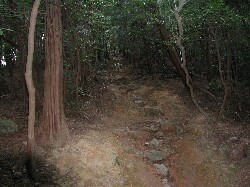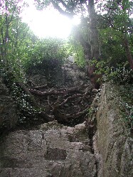 「近江富士」三上山への登山はこちら「近江富士」三上山への登山はこちら「近江富士」三上山への登山はこちら「近江富士」三上山への登山はこちらようやく、今回で、三上山への登山も最終回。8月6日のことですから、かなりまとめるのにかかってしまいました。ようやく区切りがついて、ホッとしています。では、いきなりですが、本題へ行ってみましょう。★巨石を縫って三上山の山頂へ★の後半部分で、登り始めて5分で息が上がってしまい、そんなはずはないと、自分の体力のなさに愕然としてしまい、そうこうしているうちに、傾斜は容赦なくきつくなってきて、巨石もたくさんでてきて、もう風景を楽しむ余裕もなくなって、虫の息になったところまで、書きました。(^^; 山頂までは、結局40~50分かかったのではないかと思います。最後の15分は、もう心臓が破裂しそうなくらい、きつかったです。上記のような巨石がドーンと待ち構えていて、そこを登っていく感じです。三輪山を登ったときも、足はがくがくで、心臓が破裂しそうだった記憶はありますが、ここまで険しくはなかったと思います。手すりもついているのですが、まさに岩を登っていく感じです。さすが表参道、一番きついと聞いていただけはあります。「でもこんなにきついなんて聞いてないよ」と内心思いつつ、今さら戻るわけにもいかず、歩を進める以外にありませんでした。ただ、ほんとに気力とは裏腹に、体は正直で、足が動かない。(^^;自分では一生懸命動かしているつもりでも、おそらく傍からみたら、スローモーションで足を動かしているように見えたに違いありません。最後は、何というのでしょう、手すりにつかまって岩を登っていくという、まさにロッククライミングをしているような(したことないですが…)状態ではなかったかなと思います。自分の体力のなさを痛感した日でもありました。そうして、もう虫の息で、何とか山頂へ到達!!山頂へついたら、おじさんのグループが、5,6名いらっしゃいました。息が上がってますから、必死で挨拶を交わして、それでも鳥居と磐座(いわくら)が見えたときは、ようやく来た、と達成感がありました。 ▲山頂の奥宮御上神社の奥宮ですが、その時は、きちんと見る余裕もありませんでしたが、よく見ると、中央の社と左右に小さな社が建っています。三つの社から成っていると見ていいのでしょうか。麓の御上神社も、社が三つです。神社ではこういう構造が普通といえば普通ですが、前回見た「三」の重要性から見たら、おもしろいものがあります。日本神話の原初の神は「造化三神」ですから、神社は三神を祀る構造が、もともとあるのかもしれません。祭神なども、三神祀っているところが、けっこう多いように思います。だから神社では、社が三つあるところが多いです。三神を拝する構造でしょうか。御上神社、三上山、はまさに、「みかみ」=「三神」に通じると思います。 ▲奥津磐座山頂の鳥居の手前に、この奥津磐座はあります。大きさは、幅約3m×高さ約2mになるといいます。そんなに大きなわけではないでしょうが、ほぼ山頂付近にボコッとあるので、神聖な雰囲気です。この磐座に、天之御影神が降臨したということになるのでしょうか。そこから、三上山の祭祀が始まったということになりますし、神が降臨したとされる旧暦の6月18日には、神職者が三上山頂上に登って、ここで神を降ろす祭祀である、「山上祭」が行われるといいます。その後、麓の御上神社で、改めて神を迎える祭祀が行われるそうです。★下山は裏参道から★しばらくすると、おじさんのグループは下山し始めましたので、一人になりました。もう一度、社に無事登れたことの感謝で手を合わせて、磐座(いわくら)を眺める位置に腰掛けました。展望も申し分なく、少しの時間たたずんでいると、疲れも少しずつ抜けていくような気がしました。携帯電話から、家へ連絡を入れました。「いやー、想像以上にきつかったよ」などと妻に言いながら、妻は、娘も連れて行ったら、みたいなことを言っていたので、「連れてこなくてよかったよ」と。もし、5歳の娘を連れてきたら、とてもじゃないけれど、登れないでしょうし、私が背負うはめになっていたことは明白で、そうなるとあのきつい岩盤はとても登れなかったのではないかと思います。さて、下山しようという段になって、今登ってきた傾斜を降りることを思うと、ちょっとゾッとするものがあったので、今度は裏参道から下山してみようと思い、そちらのルートを取りました。表参道に比べると、岩盤などがまともにない分、まだ少しはましかもしれませんが、でも、けっこうきつい傾斜のところもけっこうあり、どちらを選んだにせよ、楽じゃないな、と思いました。下山して、再び御上神社へ行き、無事登らせていただいたことの報告をして、帰途に着きました。8月6日誕生日の朝に登った三上山、非常に良い思い出となりました。そ