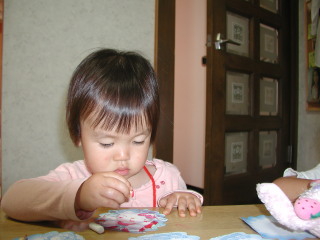 ▲葵:真剣になると口がとんがって怒ったような顔になるんだけど、何か?上の娘のともえが、今週、ようやく補助なし自転車を乗れるようになったということで、「お父ちゃんに見てほしい」とはりきっていたそうです。で、今日、見てあげました。先々週くらいだったか、全然乗れなくて、後ろから支えてやってたのですが、これは、乗るのに時間がかかるだろうなと感じていました。でもふらふらしながらも、乗れるようになっていたので、成長したなあとびっくりしました。「やればできるんだよ」と言ったら「うん」と言ってました。そして、「それは何にでも言えるんだよ」と。そう、やればできる。やろうと思えばできる。これは自分自身に向けての言葉でもありました。娘に言ってながら、自分に向けて言っている言葉って、けっこうあるんですよね(^^;;2歳の葵は、言葉になってきました。おもしろいです。「だいじょうぶ~?」とか「あいたた…」とか言うようになり、いやなことは「いやぁ~」と意思表示もはっきりしています。いまだ、服は気にいった2枚しか着ないそうで、かなり頑固です。今日の朝も、そのお気に入りの服がぬれているから、他のを着せようとしても「いやあ~~」と泣いていました。結局着ずに、もうひとつのお気に入りの服を着ていました。いつまで続くのでしょうか…。