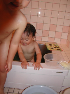 お風呂上りの2歳の葵(あおい)。見たら、ちょこん、と律儀に正座してました。手も膝のうえにのせて、妙にかしこまってます。何だか笑えて、思わず、撮ってしまいました。普段着は、以前書いたように、まだ、お決まりの2枚しか着ません。苺の模様と、ミキハウスとロゴの入ったもの。何のこだわりがあるのか、とにかく、その2枚以外は、ダメです。昨日は、6歳のともえと、妻が、他の服を着せようと、必死だったようです。ふたりで、この服かわいいねえとか、さんざんおだてて、何とか着せたようです。この写真のお風呂上りの時も、決まった下着しか着ないようで、私が、他の下着を差し出しても、ぐいっと手で払いのけました。「これかわいいね~~」って言って、「ほら、着てごらん」って言っても、またぐいっと払いのけます。ダメだこりゃ、って思いました。だから、お風呂上がっても、しばらく裸のまんまです。そのうち、妻がちょっと怒り出して、それでも他の服を着ないので、葵は、わ~~わ~~素っ裸のまま、泣き出しました。まあ、いつものパターンと言えば、いつものパターン。無理に現状を変えようとしても、できないようです。クリア道的にいえば、ありのままを認めるってことでしょうか(^^;;これでいいと。別に変えようとしなくてもいいのかもしれません。このまま成長して、服が小さくて着れないようになってまでも、まさか着ようとするとも思えないし、まあ、そのうち、いろんな服を着ていってくれるでしょう。気長に待つしかないようです。