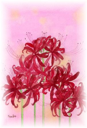 三つ葉さんにお願いして書いて貰った絵です♪ 子供の時から、大好きな 大切な お花♪ やさしい三つ葉さんの心と手で描かれた、やさしさと元気をくれる絵彼岸花は、リコリス、曼珠沙華とも呼ばれます。名前由来は、=彼岸花=秋のお彼岸の季節に開花するから=リコリス=ギリシャ神話の海の女神=曼珠沙華= 「天上の花」という意味で、慶事が起こる前触れには 赤い花が天からふってくるという仏教の経典による。 梵語(ぼんご)からで,白くやわらかい、 見た人を悪から離れさせる力がある天界の花との説もあります。花言葉は「情熱」「悲しい思い出」「独立」「再会」「あきらめ」「恐怖」血のような花のイメージから墓に植えられ花言葉「悲しい思い出」が生まれたのでしょう。また特殊な美しさから「想うはあなた一人」「また会う日を楽しみに」の花言葉あります。強い生命力の彼岸花は、痩せた土地でも育ち大きな球根を作ります。全草有毒で、ひどい場合には中枢神経の麻痺を起こして死にいたる。でも、良く水洗いすれば消えるそうです。 毒があるのは知ってましたが、死にいたることもあるし、 食べることも出来ることにはびっくりしました。 季節は 春 桜が満開ですね いろんな願いを込めて、UPしちゃいました 人々の上に「天上の花」がふりますように