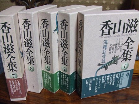 久々に、時間をおいて、古本屋(全国チェーンのではなく、昔ながらの、です)に行くと、思わぬ本が棚に並んでたりして、嬉しい。 よく行く古本屋に香山滋の全集が何冊か置いてあり、買った。 香山滋はおおざっぱに言うと、江戸川乱歩や横溝正史などとほぼ同時代の作家で、推理小説ではなく探偵小説と言われていた時代の、大衆文学作家です。(たぶんこういう説明で合ってると思う。) この時代の探偵小説作家が大好きで、特に、久生十蘭、夢野久作、香山滋が今はお気に入りです。 久生十蘭はすべての作家で一番好きといってもいいくらい大好きで、僕のイメージではとびきりうまい書道家が毛筆で書いた優雅な作品のように、美しい文章を書く作家です。 夢野久作はこの三人の中では一番よく知られていると思う。代表作「ドグラ・マグラ」のように夢と現実の境が定かでない、不思議な小説ばかりだけど、この人の文章は、僕はリズムが合うというか、読みいいというか好きです。 最後に、香山滋。「オラン・ペンテグの復讐」「キキモラ」「ネンゴ・ネンゴ」とか、訳のわからない題名が多く、爬虫類や南米のジャングルを題材にした小説がたくさんある。文章がすごく巧いとは言えないと思うんだけど、香山滋の誰にも似てない独自の世界は読んでるうちに、はまります。不思議な魅力です。 あんまり知られてない作家ばかりだと思います。少し悲しいというか、だからこそ愛すというか、そんな思いで書いてみました。