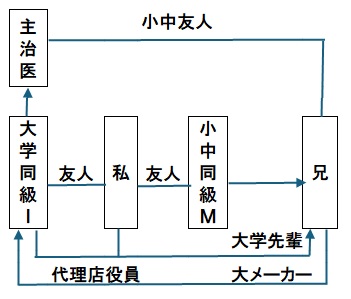 今でも親しくしている大学時代からの友人がいる。その彼の主治医MA先生、、出身地は私が育った地方中都市らしい。お医者さんになるくらいだから私と同じ小中学校の可能性もある。さっそく卒業生名簿を引っ張り出してみると、まさに予想通り、小中とも私の5年先輩であったから小学校では会っているはずだ。 一方、私の小学校中学校で同級だったMO君、家業を引き継いでパン作りを生業にし、批評してほしいと試作のパンを時々送ってく「れる。食レポをFacebookに載せたところ、あそこのパンは美味しかったとMA先生が思い出を載せてくれた。詳しく聞いてみると、MA先生とMO君のお兄さんとは小中学校の同級で割と仲の良い友達だったとのこと。これでMO君のお兄さんとの関係は2ルートできたわけだが、話はそれで終わらなかった。大学の話をすると今度はMO君が驚いた。お兄さんと私は大学同窓ではないかという。同窓会名簿を調べると同大学同学部で私より4年先輩。しかも誰でも知っているマンモス大学ではなく、地方からの入学者はあまり多くない中規模大学。これで三つの関係で私とMO君のお兄さんは繋がってしまった。ここまで来るとなんだかややこしい関係になるので図にしてみた。 図内で私の大学友人I君以外は小中学校の同窓だから、その関係も考慮すると四つの関係で繋がっている。想像以上に世の中は狭いのかもしれない。