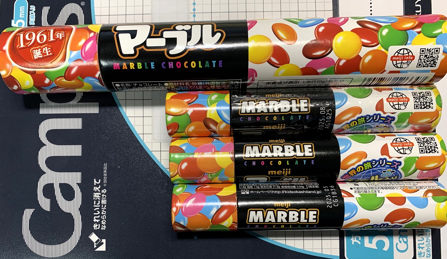このところあちこちの食料品店やホームセンターに駄菓子コーナーがある。その中に懐かしき明治マーブルチョコがあった。うれしくなってついつい買ってしまう。近所のドラッグストアのお菓子の棚に、普通にマーブルチョコが置いてあるではないか。それもまた買ってしまう。1961年誕生と書いてある。私が小学生の時。中にシールが入っていた。折から放映された鉄腕アトムのキャラクターでアトム、ウランちゃん、お茶の水博士などのシールが入っていたと思う。チョコレートよりもそのシールが欲しかったのかもしれない。それから十数年、就職試験で"marble"を含む英文の和訳問題が出た。私はちゃんと「大理石」と訳したが、一緒に受験した同級生は「円柱」と訳してしまった。マーブルチョコの連想だったに違いない。まあ、致命的な誤訳ではないと思うが。
