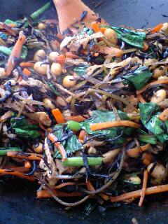 ヒジキ 大豆 人参 昆布 ほうれん草などをごま油で炒めて味付けはめんつゆ(^O^)/