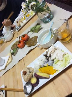 お店に入ってテーブルに着いたら まず「木柵鉄観音」が出てきてホッと一息(´∀`) ランチはお野菜たっぷりで、カラダに優しい感じのお料理でした。まずスープが出てきて、そのあと野菜&鶏肉&ご飯が入ったお皿が出てきました。野菜には特に味付けしてなくて、ごまだれ、ゆず胡椒マヨネーズ、お塩をつけていただきます♪
