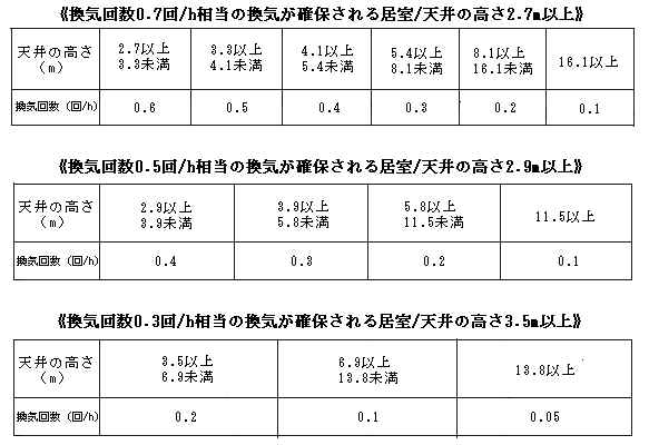 ホルムアルデヒドを発散する建材を使用しない場合でも、家具からの発散があるため、原則として住宅などの居室では0.5回/h以上、その他の居室では0.3回/h以上の換気回数を確保できる有効換気量を有する換気設備の設置が義務付けられています。太文字部分の原則としてという部分は、下記の「令第20条の6」に触れられています。 「前項の規定は、同項に規定する基準に適合する換気設備を設ける住宅等の居室又は その他の居室とそれぞれ同等以上にホルムアルデヒドの発散による衛生上の支障がな いようにするために必要な換気を確保することができるものとして、国土交通大臣が定め た構造方法を用いる住宅等の居室若しくはその他の居室又は国土交通大臣の認定を受 けた住宅等の居室若しくはその他の居室については、適用しない」下線部の国土交通大臣が定めた構造方法(国土交通省告示第273号)によると、 ・常時開放された開口部の換気上有効な面積の合計が床面積1m2当たり15cm2以上設けられた 居室 ・真壁造の建築物の居室で、外壁、天井及び床に(※1)合板その他これに類する板状に成型 した建築材料を用いず、かつ、外壁の開口部に設ける建具が(※2)木製枠で通気が確保 できる空隙(隙間)を有するものを用いるこれらに該当する場合は、住宅などの居室では0.5回/h以上、その他の居室では0.3回/h以上の換気回数を確保できる有効換気量を有する換気設備は設けなくてもよいこととされているので、原則としてという表現になっています。 ※1 合板その他これに類する板状に成型した建築材料とは、合板、MDF、パーティクルボード などのボード類のことです。 ※2 現在、住宅などで使用されている通常の木製サッシは、一定の気密性を有するので、 「木製枠で通気が確保できる空隙(隙間)を有する」建具には該当しないと考えられます。又、住宅などの居室では0.5回/h、その他の居室では0.3回/hに相当する換気量が必要有効換気量となっていますが、天井の高さが高い居室(下記の表参考)については、換気回数を緩和することができます。換気回数(回/h) 換気量(m3/h)を室内の容積で割った値で、室内の空気が1時間に外気と入れ替わった回数 のことです。換気量(m3/h) 室内の空気が1時間にどれくらいの量入れ替わるのかを示します。