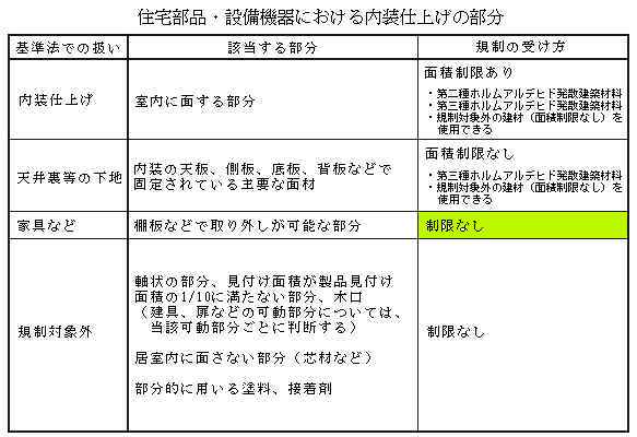 居室の内装の仕上材の規制の対象となる範囲(部位)が下記のように定められています。 【規制対象】 ・壁、床、天井、屋根(天井を貼らない場合)、建具(ドアなどの居室の室内に面する部分)など の面的な部分 ・あらわしで使った柱などの軸材で、露出面積が室内に面する部分の1/10を超えた部分 ・造りつけ家具や建具の枠などは当該家具などの見付け面積の1/10を超える部分 ・室内に直面するボード類(表面化粧などの二次加工を含む) ・「透過性」(通気性)のある材料を貼ったボード類 ・「透過性」のある材料には、壁紙やカーペットなどが当該 【規制対象外】 ・廻り縁、窓台、窓枠、手すり、巾木、鴨居、敷居、長押、見切り、落としがけ、畳寄せ、障子、 カーテンボックスなどの造作材、建具枠、方立て、間柱、胴縁など ・柱などの軸材(軸状の部分) ・部品、設備見付け面積が1/10に満たない部分 ・部品、設備の木口 ・部品、設備の芯材など居室に面さない部分 ・部分的に用いる塗料、接着剤 ・部品、設備の内部の天板、側板、底板、棚板などで固定されている主要な面材次に、建設時に居室に設置される住宅部品や設備機器ですが、これらは構成部材ごとに ・内装仕上げ ・天井裏等の下地 ・家具などと同様の扱いとなる部分に区分され、まとめたものが下記の表のようになります。上記の表中にある棚板などで取り外しが可能な部分に関しては「制限なし(緑色の部分)」とありますが、ここについては実際に問題になった事例を「シックハウス対策に係る規制の疑問点」で述べていますのでご覧ください。