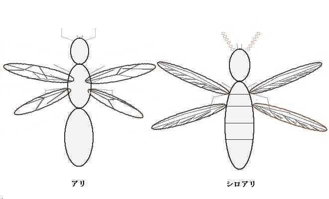 シロアリの羽アリと黒アリの羽アリには以下のような違いがみられます。 【シロアリ】 ・胴にくびれがない ・触角が真っすぐで、ネックレスのように数珠状になっている ・翅(ハネ)の大きさが4枚ともほぼ同じ ・翅脈(しみゃく)が網目状に多く走っている【アリ】 ・胴に細いくびれがある ・触角が「く」の字 雄では「く」の字状でない種類もある ・翅の大きさが違う 前翅が大きく、後翅は小さい ・翅脈が太くて少ない ※ 翅脈とは、翅にある細かい筋のことです。 《特徴を比較した図解》