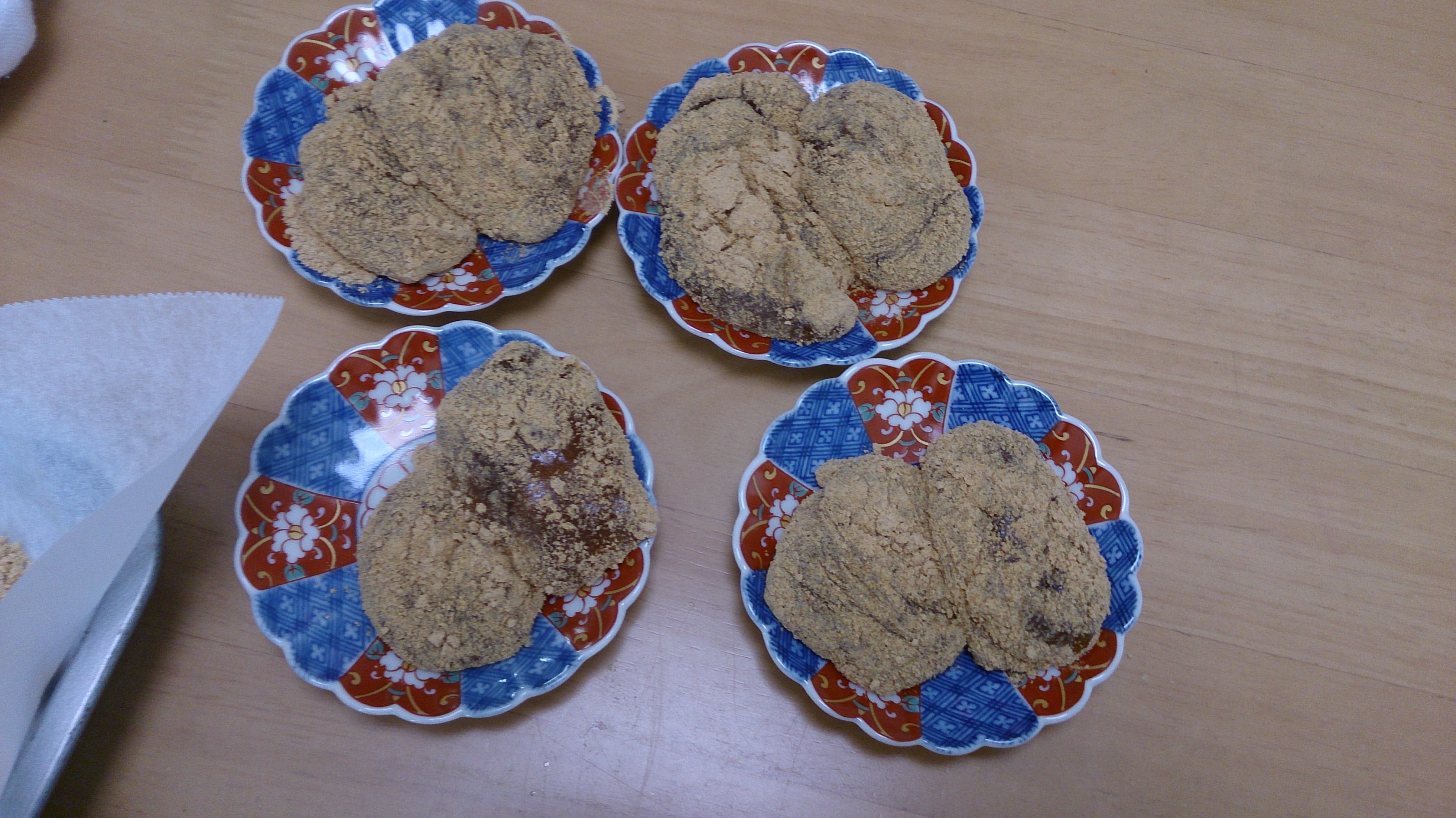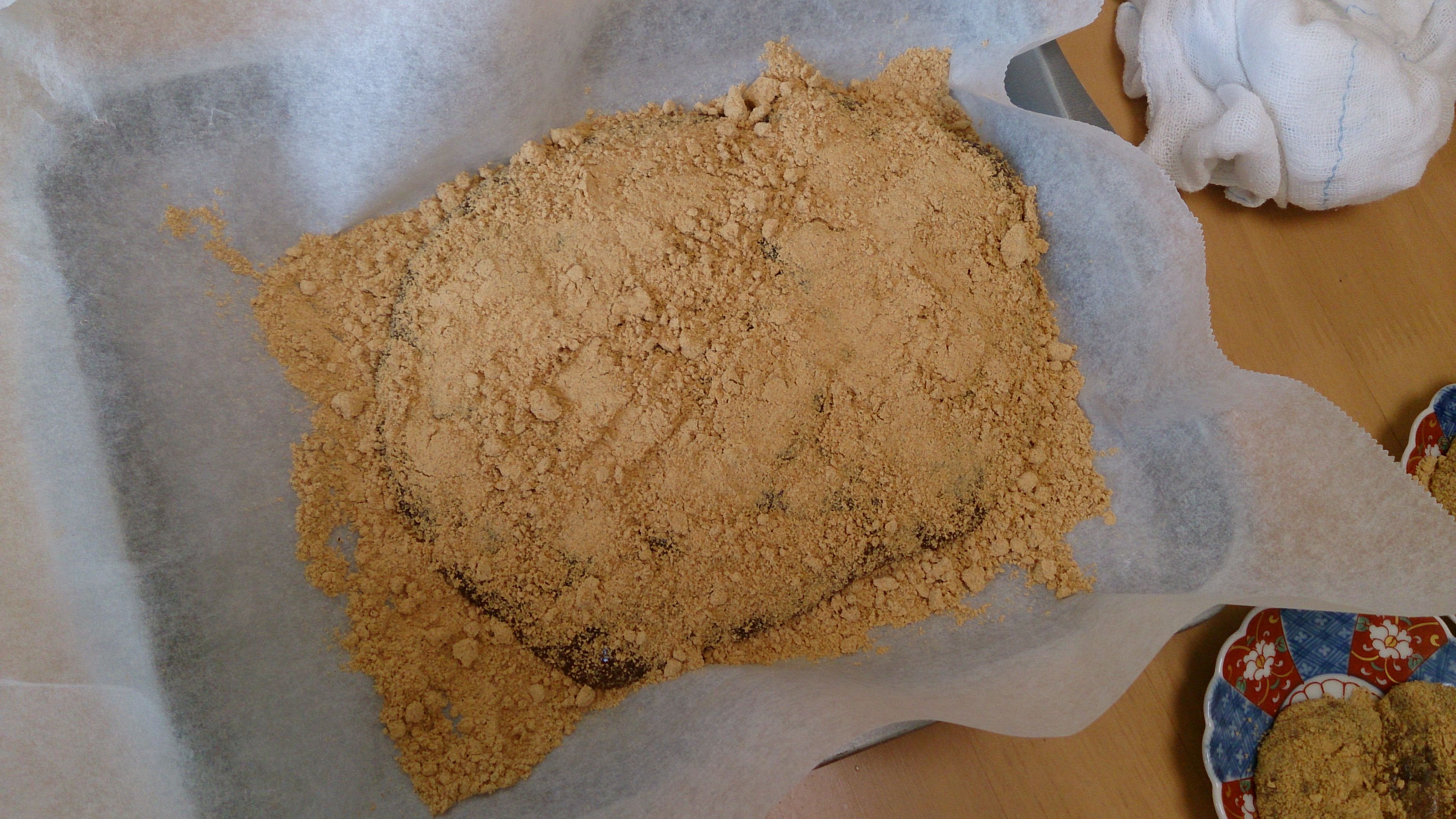 黄な粉を敷いて練った餅を乗せ、その上にも黄な粉をまぶして・・・