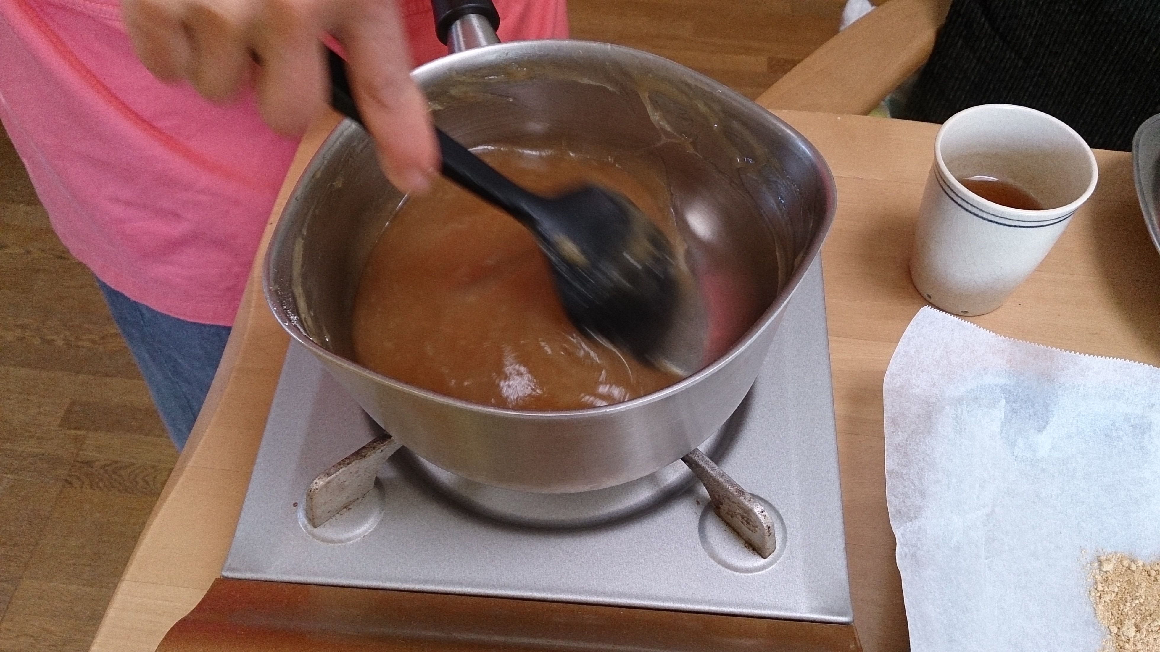 ほうじ茶わらび餅一生懸命混ぜました。火にかけながら混ぜて混ぜて