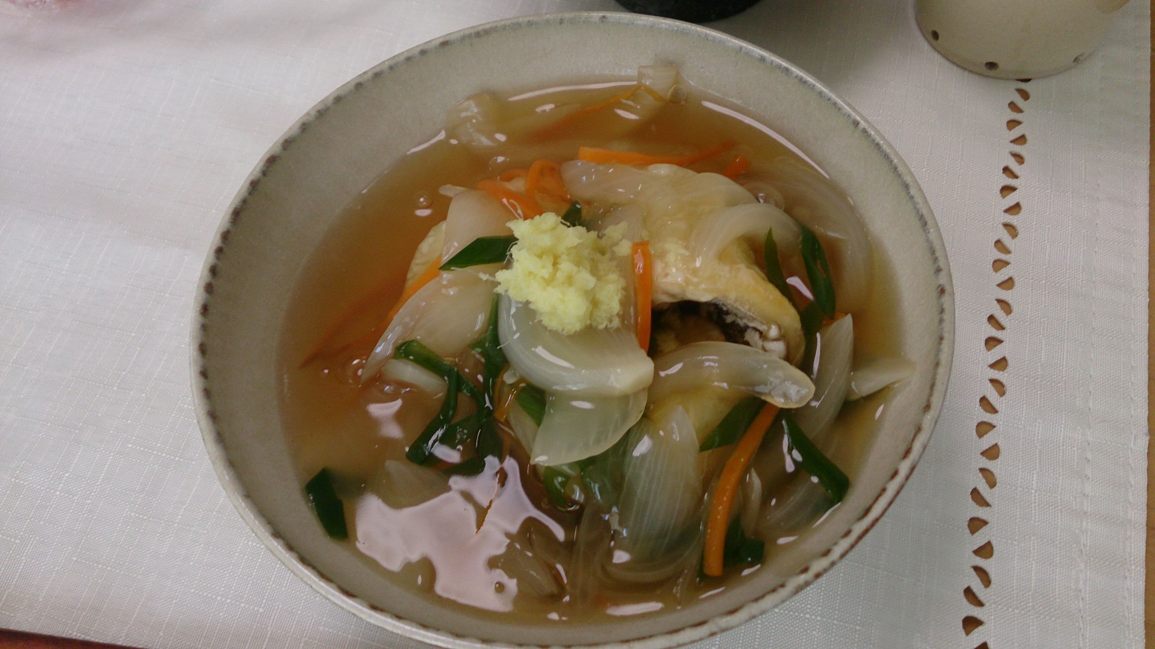 魚の野菜あんかけ。生姜がのすりおろしが乗ってます。