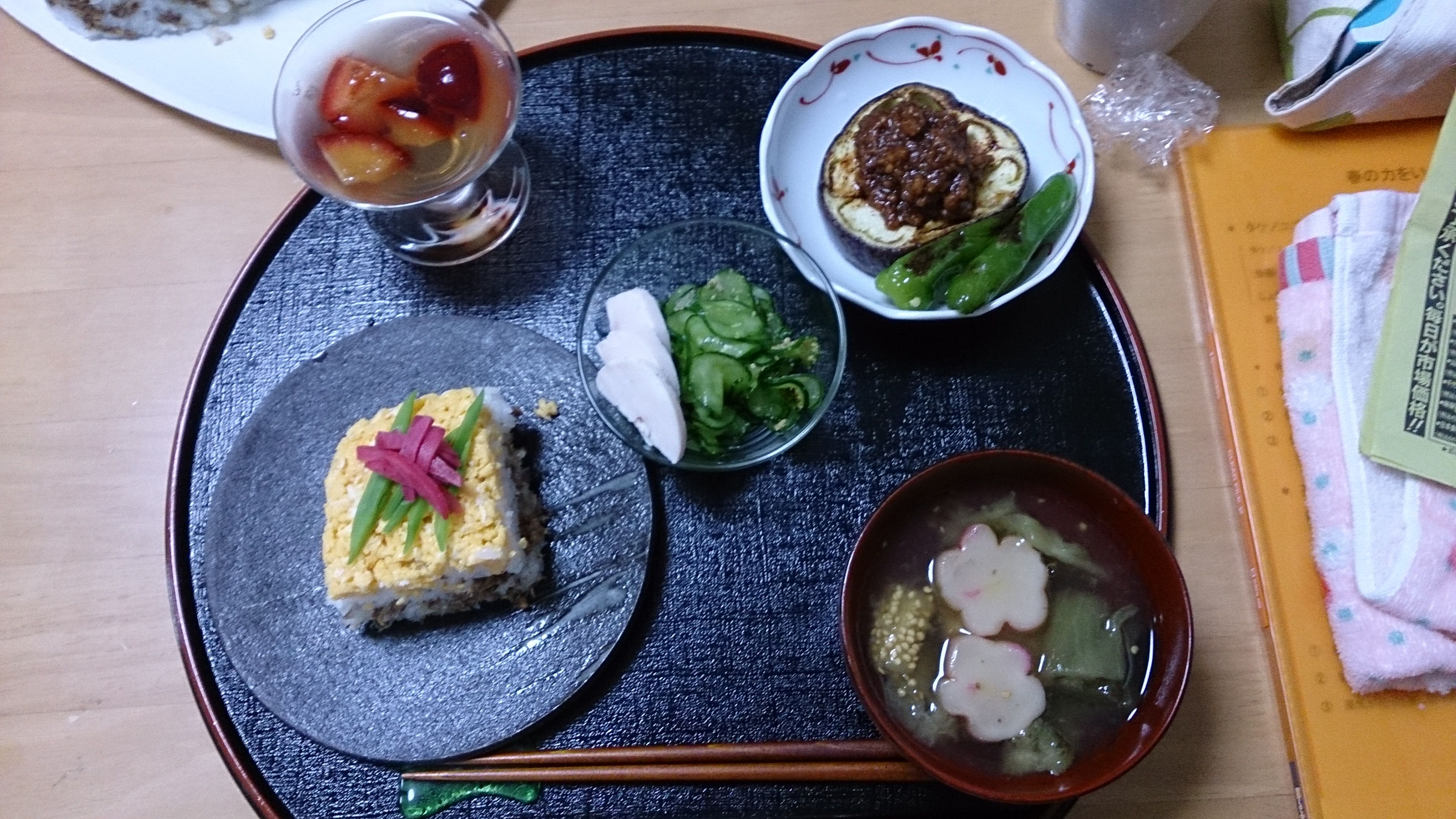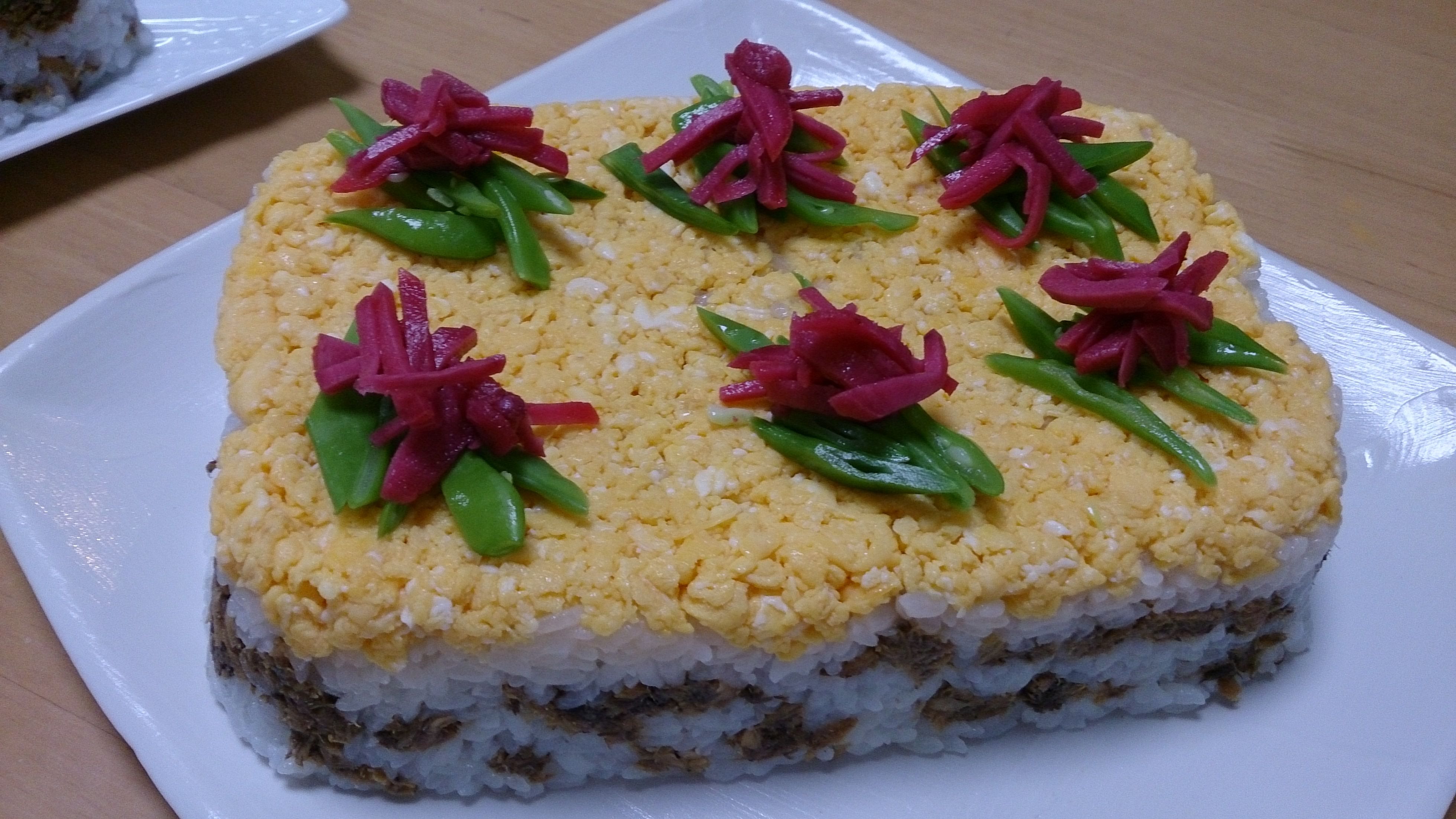 これを切り分けました。鯖缶をそぼろにして、酢飯でミルフィーユ状態に。