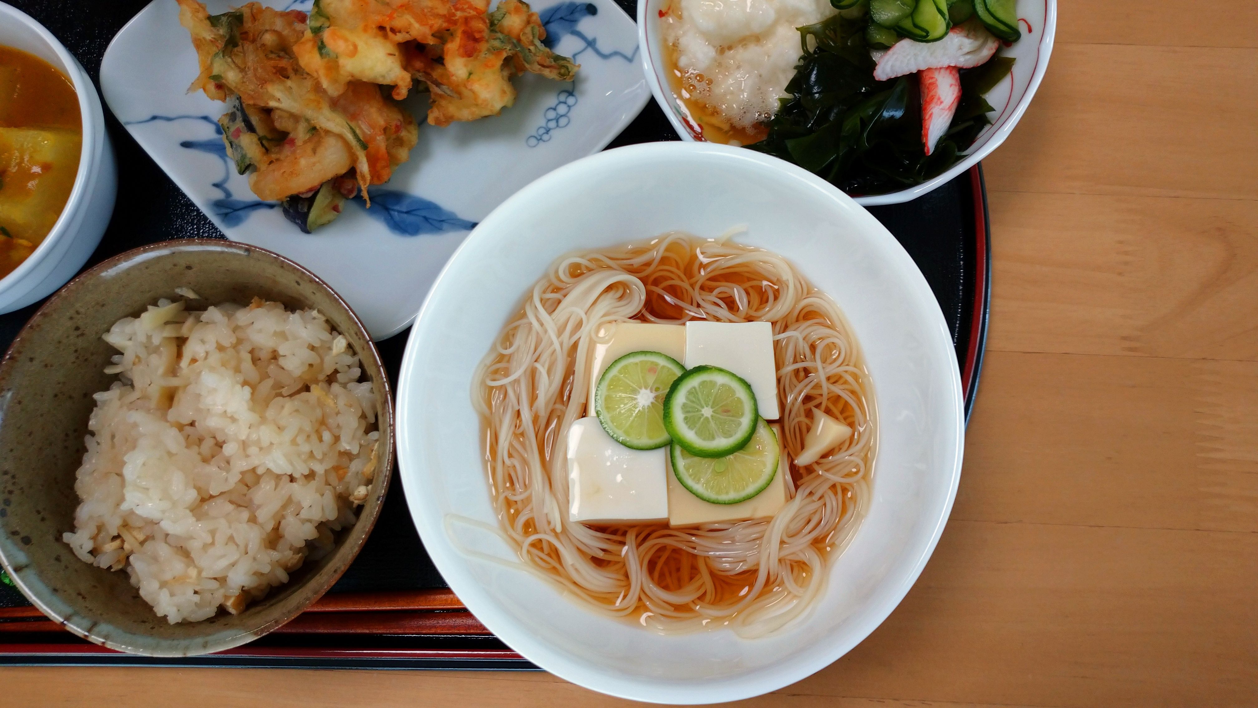 卵豆腐と絹ごし豆腐を対角に入れて、周りにそうめんを入れて、上にスダチを添えました。