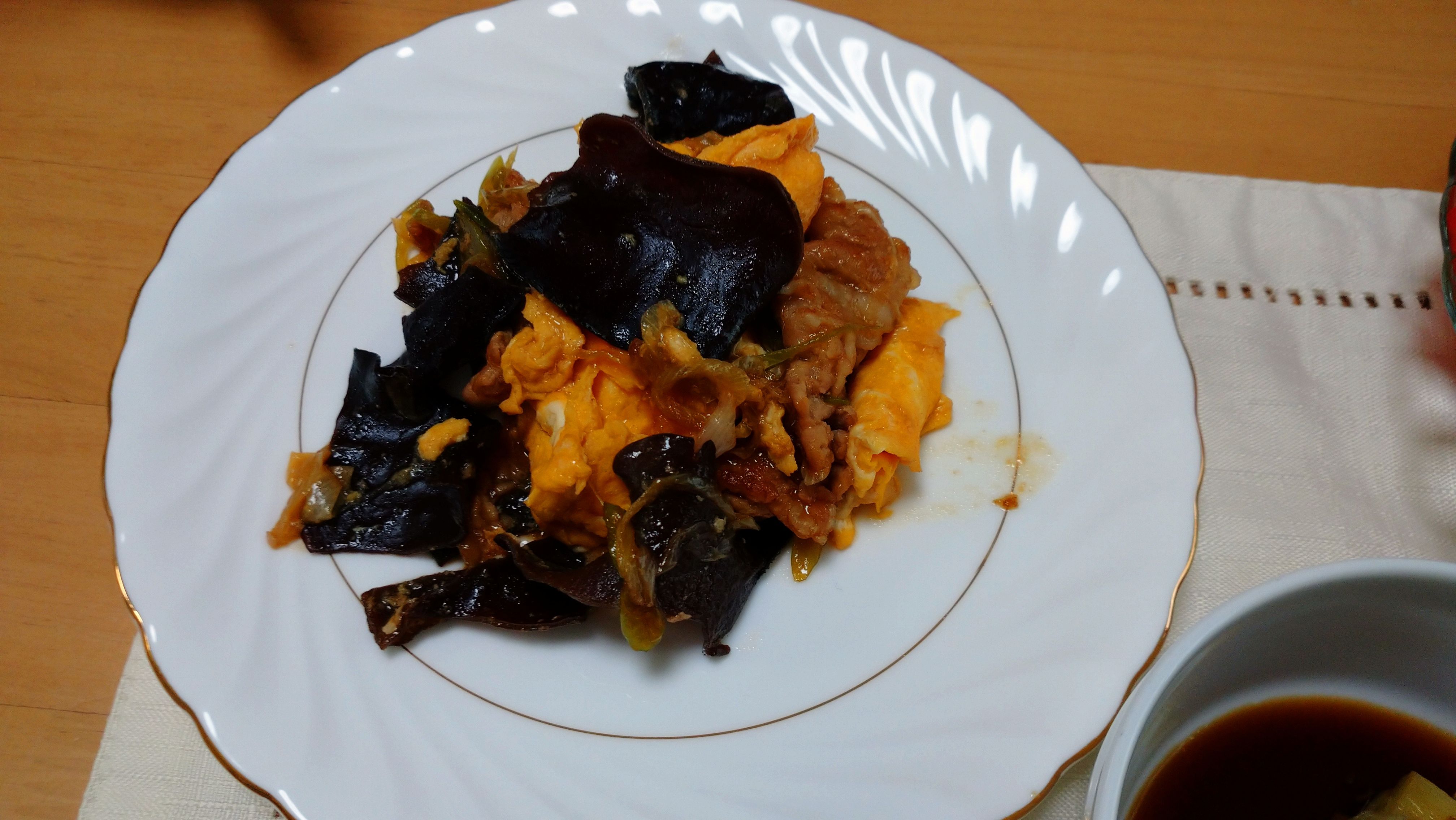 乾燥きくらげを水で戻して、豚肉と長ネギと卵と一緒に炒めたもの。