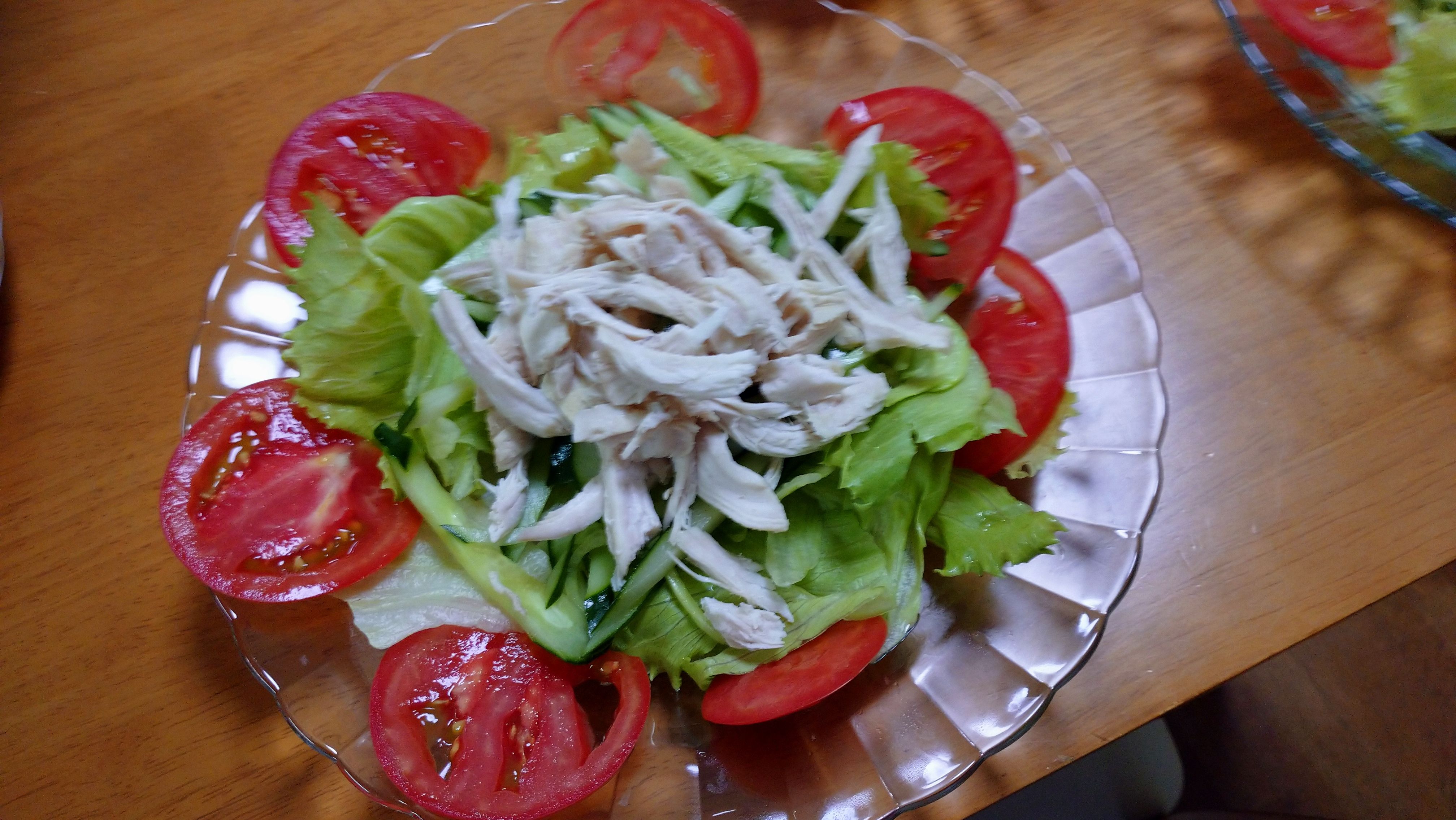 鶏の胸肉を酒と生姜とネギと一緒にレンジでチンして、野菜と一緒に飾りました。