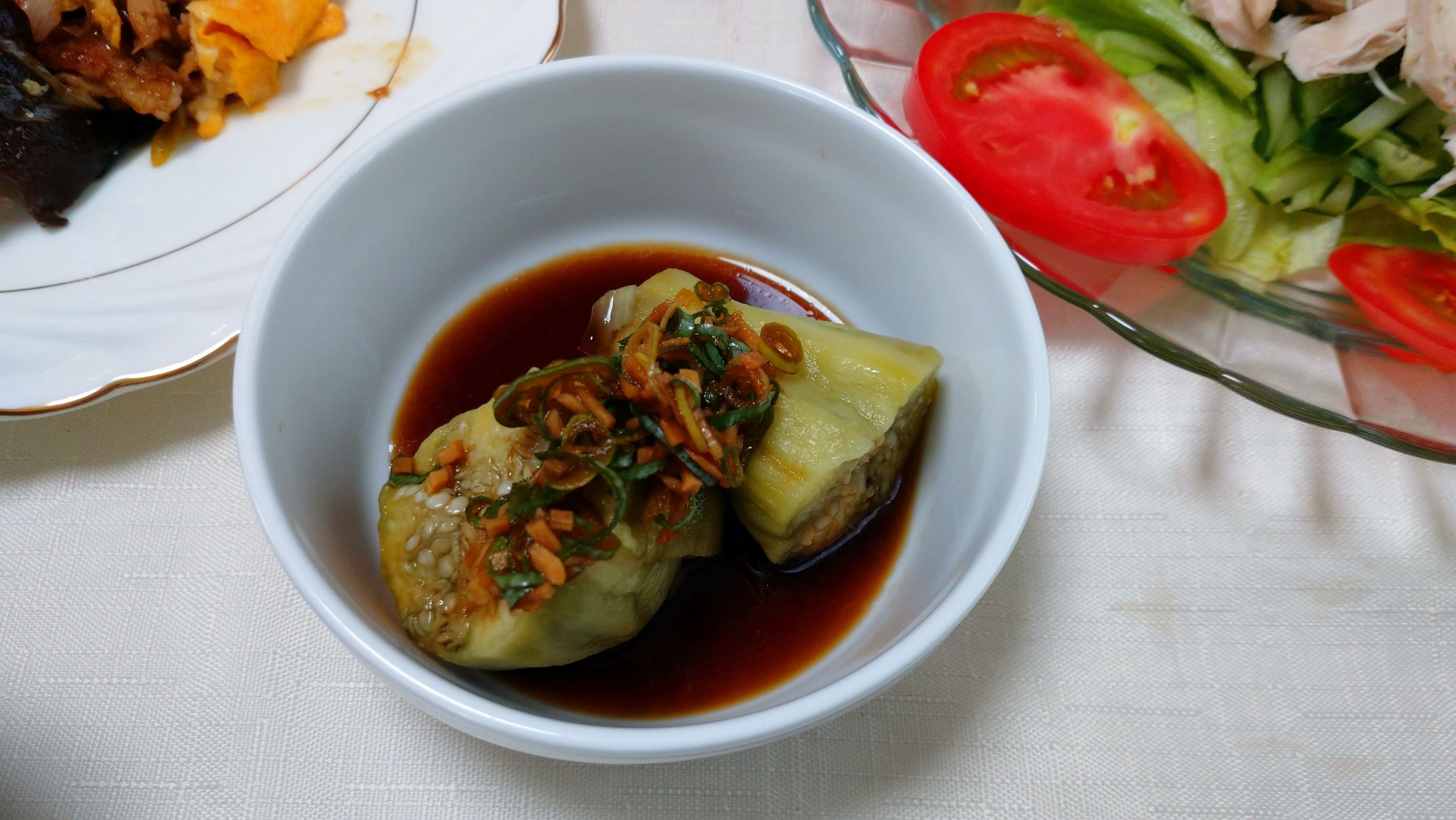 ナスをレンジでチンして、甘酢と醤油とごま油のタレをかけて…