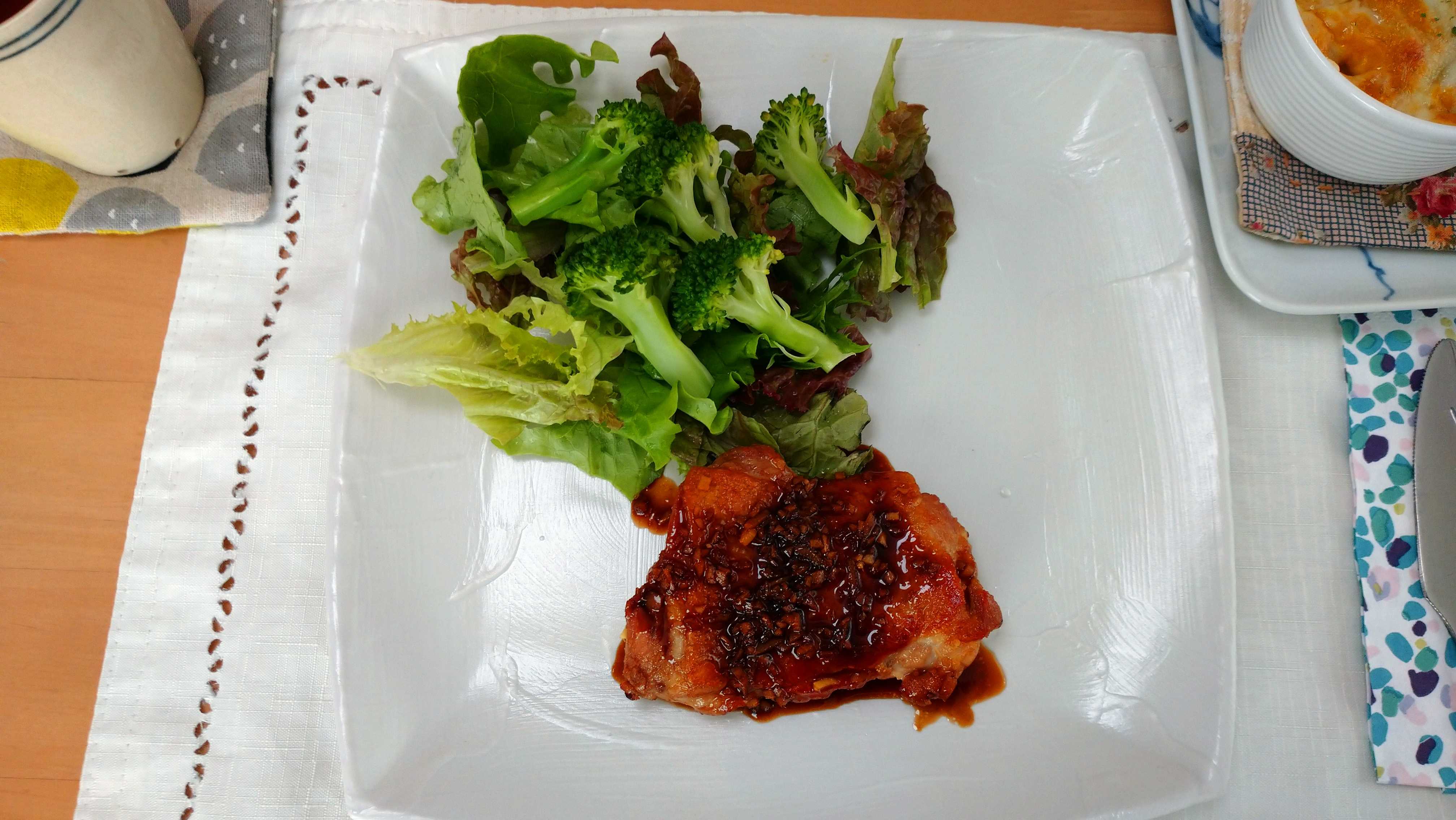 いつものチキンソテー。はちみつと生姜でソースを作って絡めました。