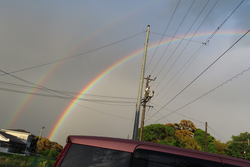 2025年5月 雨上がりの 虹 息子からスマホへ電話 凄く奇麗な 虹が出てるゾ!見てごらん~・・・と言われ、 直ぐスマホとカメラを持ち外へ 凄い~~チョー今まで見た事が無い位奇麗な虹が出ていました早く写さないと、直ぐ消えてしまいます 良く見たら、 二重の虹です アッという間に真ん中が消えて行きました~~このブログにも、 動画を載せる事が出来れば嬉しいんだけどね! 虹を一枚の写真へ載せる事が出来ません~一枚目には 二重の虹が写っていますヨ 今日も訪問ありがとう~また来てねバイバイでチュッ