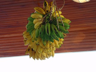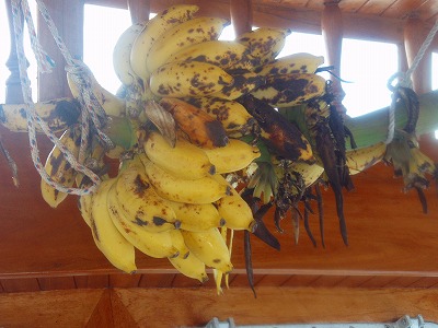 三日目は朝5時半起床バナナはこんな感じになりました ↓ 青い部分はすっかり黄色になってしかもみんながしょっちゅう食べてるので実も減ってきています(笑)食べたバナナの皮は海へポイッ。自然に返す仕組み さて、早朝ダイブ一本目はカンドゥーマティラ(南マーレ環礁南部)6時半潜行開始。ここではホワイトチップ(鮫)やマダラトビエイなんかを見る事ができました♪一本目が終わって朝食。相変わらず美味しい~(*^o^*) そしてその後ジンベエサーチが始まりますジンベエザメはとにかくダイバーの憧れでございます。ジンベエサメ・マンタ・ハンマーヘッドを見れば三冠達成!と言われますそれぐらいどこでも普通に見れるお魚ではございません!!! ジンベエサメ:軟骨魚綱テンジクザメ目ジンベエザメ科ジンベエザメ属に属する世界最大の魚。サメの中でも最大の大きさを誇る種類です。 現在知られている最大のジンベエザメは体長14m。体の幅は1.5mぐらい性格はすごいおとなしく臆病。だから人が集まるところに出てくる事はあんまりないんだよね。また見つけて寄って行ってもすぐいなくなっちゃう。スキューバダイビングの世界では、「ダイバーの憧れ」とされております!!! で、このジンベエザメを船から探して行きましょう!って事で2~3時間移動です。 その間みんなはいつでも海へ飛び込めるようにフィン・ブーツ・マスク・スノーケルの3点セットを常備。水着着用のままお昼寝タイム♪ 3時間ぐらい?探したけどジンベエ見つからず・・・そんなわけで海の中から探す事になりましたブリーフィングの最中、ガイドののりこさん・・・ 今回のポイントは「アリビーチアウトサイド」という場所になります。ここでジンベエを海中から探したいと思います!!ここでもマンタや鮫、他の色々な魚が見えますが・・・一切無視して下さい!!!いいですかぁ~皆さん!今回の目的はジンベエです!!!何が出ようとジンベエ以外は無視です!無視! っとまぁここまでの気合の入れよう(笑)しかも運悪く、とも姉属するCチームの拓ちゃんが200本潜水記念。海中で写真を撮るんだけど・・・みんなから一応写真は撮るけどさ~もし写真撮ってる最中にジンベエが出たらもう拓ちゃん置いてうちら行くから!写真どころじゃないからねぇ~(* ̄m ̄)プなんて言われる始末(笑) そしてのりこさん今回はチームを二手に分けます!AチームとBチーム。Aチームは外側を。Bチームは内側からジンベエを探していきます。どちらかにジンベエが出たらガイドが鈴を思いっきり鳴らすので鳴った方向へ皆さん猛ダッシュしてきて下さい!そしてこれは絶対にあっちゃいけない事なんですけど・・・・もし・・・もし万が一・・・ガイドより先に皆さんが見つけた場合その時は声を大きく出して下さい!!!声を大きく出すって・・・・(-_-;)死んじゃうじゃん(笑)でもレギュレータ加えたまま声を出す事もできる。これが結構響いたりするんだよね。そして周りの人に知らせて下さい! でも・・・もし・・・そこまでしても誰も気付いてくれなかったら・・・・気付いてくれなかった!?自分の胸の中に秘めておいて下さい確かに・・・15人でジンベエを見るのが目的。1人だけ見たなんて言った日にはあんた・・・半殺しだよマジで(笑)ただ・・・ジンベエダイブに一致団結してる中でも釣り好きの石浜さん・・・『俺釣りしてるから行ってらっしゃ~い♪』っと1人釣りでございます。。。ダイビングより釣りらしい(^_^;) そして昼・・・2本目潜行開始です。モルディブは今雨期。プランクトンが大発生でかなり視界が悪い・・・こんな中ジンベエなんて見付かるのかなぁ。。。そして潜水する事40分・・・ うちらのチームとは別に潜ってた祥平さんがジンベエを見つけたらしく海の中ですんごい音の鈴の音が・・・シャンシャンシャンシャンシャシャシャシャシャシャーン!!!AチームもBチームも全速力で鈴の鳴る方へ・・・だけど見失っちゃった(T-T)そんなわけで海の中でジンベエは見れず拓ちゃんは無事200本記念写真を海中で撮る事ができて終了(笑)船に上がってからが大変AチームとBチームでの会話Aチーム:ジンベエ見れた?Bチーム:いやいや見れなかったよぉ。そっちは?Aチーム:うちらも見れなかった~ なんて言ってるけど・・・最初にのりこさんに言われた通り胸の内の探りあい(笑)こいつら本当は見てるんじゃないのか??お互い疑心暗鬼です(爆)そしてうちらが帰ってきた時、釣り好きの石浜さん船の後から『お~ジンベエ見れたかぁ?』そこでみんな声を揃えて胸の中だけに閉まっておくよ! その後夕方『クダラティラ』というところで3本目を潜り、本日のダイビングは終了。ジンベエサーチはまた明日に持ち越しになりました。もちろんその日は悔しいのでみんなで飲みです!!泡盛をしこたま飲んで9時には就寝規則正しい?生活でございます