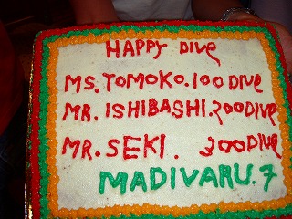この日も朝5時半起床♪規則正しい?生活を送っているせいか朝の目覚めはスッキリ。お酒も残ってな~い(*^o^*)(おっさん連中は残ってるらしいが(笑))バナナもこんなになっちゃいました ほとんど食べ尽くした(笑) 今日の一本目は昨日に引き続きフィッシュヘッド。ミーィングでのりこさんが早朝で潮の流れが速いので体育会系のダイビングになりそうです♪でも魚は昨日よりもたくさんいると思いますよぉ(^o^)っとの事。へぇ~楽しみ☆なんて思ってるとここで発表があります!今朝一本目のダイビングでなんと とも姉さんが100本目ダイビングになりました~!皆さん拍手~!! えっ(°口°;) !! 憶えててくれたの!?そう、ダイビングをした後にはかならず『ログ』を付ける。潜った場所、気温、水温、ダイビング時間、最大深度、平均深度、潮の流れ、見た魚等々。それで経験本数を記録し、ダイビング地でインストラクターに申告をする。インストラクターは経験本数と最終ダイビング日から状態をみてその人にあったダイビングを案内する。 とも姉・・・ログ付けが面倒で半ば記録していないのが多々(笑)んなわけで5年以上もダイビングやってるけど実際に潜った本数とログに記録している本数は違います(* ̄m ̄)プモルディブに着いた時、のりこさんに申請したのが90本。そこからのりこさんは数えてくれてたみたいです♪んなわけで記念ダイブです☆潜る前に・・・100本とやるつもりがミスって001になってしまった(-_-;)失敗これ・・・普通に撮ってるけどメチャメチャ潮の流れが速いところでみんな必死に岩に張り付いて撮ったもの。とも姉カツラを付けてもらったけど激流で浮いちゃってます(^_^;)今度は船上にてちゃんとカツラをかぶってハイ、チーズ♪結構似合ってね(//∇//) ?二本目はもう一度マンタ見たい!!って事で二日目と同じポイントマンタ!マンタ!マンタだぞぉぉぉぉぉぉ!!!!もうマンタ見飽きた(* ̄m ̄)プそして三本目はパウダー玉を見たい!!!っというリクエストにお答えして!!!行ってきました☆超綺麗だった~!!!その他のお魚特集♪ クタゴンベ♪こいつ結構動くから撮るのが大変(-_-;)ウミウシ。実際は体長4センチぐらい。マクロモードで撮ったよんクマノミ。モルディブのは綺麗☆悠々と泳ぐバラクーダー。フィンは良子ちゃんのフィンです(笑)ヤガラ。たくさんいたな~今日もキビナゴ大群。すんげぇいた!!寝てました。。。 これでダイビングは終了。いやぁ~毎日色々な魚に会えて楽しかった☆海も綺麗だったし最高(*^o^*) そして今晩は最後の夜でございます♪何が起きるのか楽しみよねぇ~続きは明日・・・・ププッ ( ̄m ̄*)