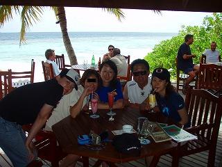 前日醜態をさらしたとも姉ですが・・・体を張った飲みですっかりおじさん達に気に入られちゃいました(//∇//) テレテレ良いんだか悪いんだか(-_-;)びみょー・・・ さて、最終日。飛行機が出るのは夕方。それまでリゾートで遊びます♪朝食を食べた後ボートでリゾートに。さすが違うね・・・綺麗な花!!!椰子の木・・・レストラン・コテージ・洒落たお土産屋・宝石店・・・ 陸で生活していないうちらにはまさにリゾート プライベートビーチまであるよ・・・入島するのに1人10ドルを払う。高いなぁ(-_-;) 釣り好きの石浜さんと海大好き関さん、そして自然児拓ちゃんの3人は早速海へダッシュ! とも姉、良子ちゃん、ゆうこちゃん、新浦パパ、亜季ちゃん(娘)の5人はトロピカルジュースを飲んでのんびりまったり♪ いや~昼間の顔のなんて清々しい顔!昨晩とは比べ物にならないわ・・・プライベートビーチもメチャクチャ綺麗でした!!リゾート気分を満喫して再び船へ。最後の昼食を食べます。う~ん美味しい!!そして最後に連絡先交換・・・ここでやっと自己紹介(笑) おっさん連中から名刺をもらうっと・・・皆さん・・・社長さん!Σ( ̄□ ̄|||)・・・・とも姉・・・この数日間・・・この方達に向かって・・・ 『うるさいな~』『っていうか超オヤジギャグなんだけどぉ~』『ウケな~い( ̄  ̄メ)』『スケベそうじゃなくてスケベなんでしょ(* ̄m ̄)プ』 数々の暴言を・・・(笑) まっそれもアリよね(* ̄m ̄)プ そしてBARの精算。一週間飲みまくった酒の代金を払います。まぁ日本からおっさん連中が持ち込んでくれたおかげでビールぐらいしか飲まなかったけど・・・そこでビックリ・・・石浜さん・関さん・新浦パパの3人組・・・確かに毎日酒三昧だったけど・・・請求された金額が3人合わせて450ドル!!これを・・・3人で割ると・・・1人・・・150ドルビールが一杯3ドルだから・・・1人50杯飲んでますそれを実質5日で割ると・・・一日に10杯は1人で飲んでる・・・それプラス泡盛やらウィスキー、日本酒・・・おっさん達・・・最強です(笑) そしてチップを余分に渡して精算した後も飲んでました・・・まだ飲むのかい!!! ちなみに日本に帰ってきてからもおっさんと飲みましたが・・・潰されました(爆) そして船の上で記念撮影いや~ホント爽やかだわ(笑)とも姉しっかり真中キープです♪楽しかったモルディブも終わり。みんなで空港へ向かいます。空港へはドーニで送ってもらうんだけど、みんなが帰るわけじゃありません!航空会社の関係でとも姉達はスリランカ。拓ちゃん、かおり、柳川さんはシンガポール航空なので夜または翌日の飛行になります。うちらを見送ってくれる3人するとそれを見たうちら・・・みんなで飛び込め~!!! っと絶叫 トップバッターかおりちゃん!!!やってくれました!!!頭から海へダイブ!!!ありがと~その合図をきっかけに祥平さん、拓ちゃんの二人も飛び込んで見送ってくれました~♪今回の旅行はとっても楽しかった(*^o^*) ちょっと真面目な話になっちゃうけど・・・今回1人で旅行して気付いた事。それは楽しみは自分で見付けるって事。周りが何かしてくれるわけじゃなくて自分から何かアクションを起こさなきゃいけないって。一週間全然知らない他人と生活。気取る事なんてできません。自分がストレス感じちゃうから。短い時間でいかに自分を理解してもらうか?どんどん輪の中に入って行って色々話して・・・そうやって人間関係を築いていく。言い方少し悪いかもしれないけど、今回のメンバーはホントに周りを気にしない人達ばかりでした。自分が楽しむ。まずは自分。お互いの楽しみ方が一致したら盛り上がろう!そんな人達ばかり。そんな中にいて思ったのは『自分を変える事ができるのは自分だけ』って事。1人参加の人達は本当に目的を持っていて、自立できていて、女性陣はみんな毅然とした人達ばかりでした。良い意味で相手の事なんか考えてちゃダメなんだなぁって。まずは自分をしっかり持った上で対人関係を築いていく事を学びました。今回の一人旅はとも姉にとってお金では買えない財産になりました。まさにプライスレスまた来るね~モルディブ!!今回は雨期にも関わらず一度も雨が降りませんでした☆とも姉の日頃の行いがよっぽどいいんだわ(* ̄m ̄)プ 行きは一人だった飛行機も帰りはみんなと一緒です♪楽しかった~☆翌日朝11時。日本に無事帰国しました(*^o^*)