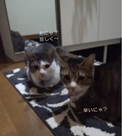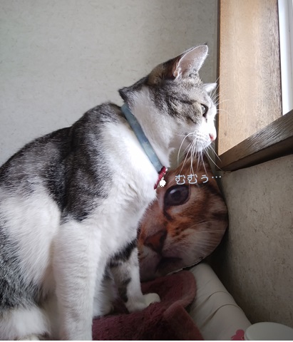 昨夜、にゃんずディナー後のことです。珍しくも、トラちゃん母娘がドライフードを数粒残したので、ミツコにおすそ分けしていると、1Fに降りていたトラちゃんがガンミ~普段、トラちゃん母娘とは違うフードを食べているので(年齢的に)ミツコ的に珍しく、美味しく食べてくれたようなのですが、トラちゃん的には、悔しかった模様( ̄m ̄〃)そこで。食べている途中のミツコにすり寄っていました、どうやら…ん~…残ってればね(*≧ω≦) ☆ご訪問ありがとうございます☆ ☆お手数ですがポチッとお願いいたします☆にほんブログ村