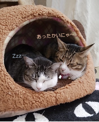 kumaru04家秋冬の風物詩、チャコとミランの「猫まん」は、気温低下に伴って、場所を猫耳ハウスに移動して展開中です(*≧ω≦)にゃん袋さんからはみ出る部位が増えてましたからねぇ本来、1にゃん用のにゃん袋さんなので、横綱級のチャコとミランが2にゃんで使用するには、元々無理があったというわけです(^^:;そしてこの時期は、もうひとつの風物詩、「猫団子」があります(^^)こちらは、メンバーが都度変ります。昨日は、窓辺で十分に温まったミツコが、とらぞーきゅんの元へひっついたところからご覧いただきます~って…あ、トラちゃんもいます。しょうがないにゃ~って言いながら、とらぞーきゅんが妹を可愛がっている、にゃんとも麗しい光景が♪思わず、ミツコをナデナデしてしまいました(=^・^=)気のせいか、ミツコの視線が…ちと厳しい(*´-ω・)ン?はいはい、ごゆっくりど~ぞ~(-∀-`; ) ☆ご訪問ありがとうございます☆ ☆お手数ですがポチッとお願いいたします☆にほんブログ村