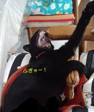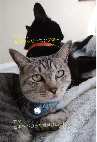 リビングで私の隣席に陣取り、何かを気にしているミツコです。このショットだけだとわかりにくいのですが、ちょこちょことお目目が動いていました。というのも私が…ねこじゃすりで、ミランにご奉仕していたからです。(小声)しかも、膝にのせているので重いったら~(-∀-`; )我が家も猫と暮らして長いので、ブラッシング用のブラシは色々と取り揃えていて、5にゃんそれぞれお気に入りがありますが、最近のミランのお気に入りは、7月に、レオン&まいあさんにいただいた、こちらでして、特に夕飯後にリクエストが激しくなります。すると、その動きが気になるミツコ、ねこじゃすりに齧りついてきます(^^:;と、そんな状況だというのに、ねこじゃすりを使っている、私の右前腕に顎をかけて、寛いでいたミランですが、ちと、ミツコの様子がおかしいことに気付いた模様。ねこじゃすりだけじゃなくて、ミランのしっぽにも反応しているんですね~(・´艸`・)これ、ミッツ。うっかりお姉ちゃんのしっぽを齧って、後で、お仕置きされても知らにゃいわよぉ( ̄m ̄〃)すると、すかさず方向転換したミツコ。要領の良さは、我が家で一番なのでした(≧m≦) ☆ご訪問ありがとうございます☆ ☆お手数ですがポチッとお願いいたします☆にほんブログ村