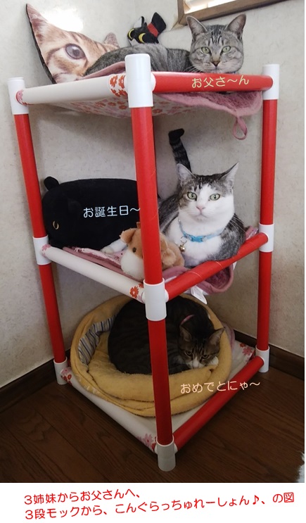 先日、お父さんのお誕生日当日に、3段モックに上手に集結した3姉妹でしたが、引き続き上段には、とらぞーきゅんが鎮座しております~え?あぁ、やっぱり下段だけじゃなく、上段にも響くのねぇ~メンバーチェンジが(*≧ω≦)ヘビー級のミランと代ったのは、フェザー級?のミツコなので、響いたのは、ミランが降りる時の重低音でしょうか( ̄m ̄〃)とはいえその早業には、とらぞーきゅんも感心した模様。どんなウデですか。それにしても特筆すべきは、下段にいながらこのドタバタに動じず寝んねしている~その通~り(≧m≦)※注 〇ケモトピアノのイントネーションでお願いしまっす♪ ☆ご訪問ありがとうございます☆ ☆お手数ですがポチッとお願いいたします☆にほんブログ村