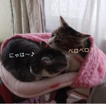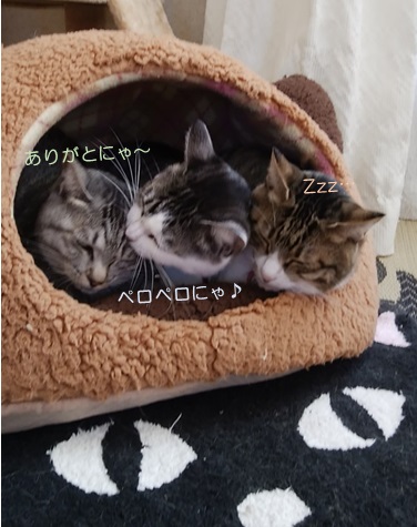 久々に、猫耳ハウスで3姉妹が勢ぞろいしています(=^・^=)チャコとミランが寝んねしているところへ、後からとらぞーきゅんが入って行って、ミランがペロペロしてあげています(・´艸`・)昨日は、とらぞーきゅんが一生懸命、ミツコをペロペロしてあげていたので、今度は自分がしてほしかったのかもしれないですね~それにしても…総重量15キロ超えなので、ハウスの寿命が心配ですが(^^:;さて、あとのふたり・トラちゃんとミツコはというと…ふたり揃って、私のベッドで…完全にお寛ぎ、ですね~なにって、トラちゃん。一応、そこは私のベッドなんですから、もう少し遠慮があってもよくなくて?しかも、あんよがミッツのお腹にかかってますわ。はぁ?そのリラックスしている体勢のどこが、何の準備なのでしょ(^^:;と、私がケチをつけている間に、くるっと向きを変えたかと思うと~ミツコのペロペロを始めました(*≧ω≦)以上、ミツコは要領がいいにゃ、というお話。…寝んねしているだけにゃのに(・´艸`・) ☆ご訪問ありがとうございます☆ ☆お手数ですがポチッとお願いいたします☆にほんブログ村