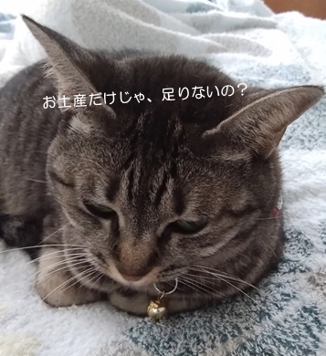 最近、夕方~夜の時間帯になると、ブラッシング&ナデナデリクエストをする、ミランです。昨日は、以前moyatodoさんにいただいたブラシを使っていると、齧りつく事もなく、おとなしくゴロゴロ言っていたのですが、突然、お耳がぴくっと、反応しました。あ、そう?気温が下がってきて(ガソリン代も高いし)、駅まで徒歩で通勤し始めたお父さんの足音を聞きわけた模様。しかも…ほほぉ、そうですか?ということで、両手に抱えている荷物を確認してみましょう。まず右手ですが~やはりまだ、歩くと汗が出るようで、カバンと共にジャケットを持っていました。そして、残る左手にはこちらをぶら下げていました。ジャンボクーヘンですぅ縦横、10センチを余裕で超えており、にゃんとも、半端ねぇ~一品です(*≧ω≦)ところで、最近の当ブログについて、お父さんが…「なんか、食べログっぽくなってない?(^^:;」と。いいいじゃないですか。元々私が好き勝手に書いてるんです。といってもご覧の通りで、責任の一端はお父さんにもありますよね(。-∀-)それにしても…お外のバームクーヘンの匂いをかぎつけるとは、ミラン、あにゃたの嗅覚、半端ねぇ~(*≧ω≦) ☆ご訪問ありがとうございます☆ ☆お手数ですがポチッとお願いいたします☆にほんブログ村