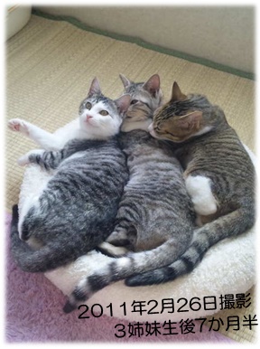 人類史に残る、未曽有の大震災から10年。その時、埼玉県kumaru04家地方は、震度5弱でした。もちろん、東北の被災地とは比べられませんが、それでも、長く大きく揺れたあの地震の恐怖は、忘れられません。出窓に置いていたTVが窓に刺さりそうだったので、必死に抑えるのが精一杯でした。揺れが収まってから、マルとペコが足元にいるのを確認し、キャリーバッグに入れました。2Fのトラ母娘もキャリーに入れて、1Fに連れてきました。しかし、断続的に続く揺れが恐ろしく、にゃんずのご飯とトイレ、ペットボトルの水とチョコレートを持って、車へ乗り込みました。そしてしばらく、道路の反対側にある更地に移動して様子を見ていました。ひとつは、我が家の駐車場がお隣の1Fの瓦屋根のすぐそばなので、車に瓦が落ちたら嫌だなと思ったからです。こんな時は、すぐに繋がらないだろうと思い、お父さんと連絡を取ったのは夜になってからでした。都内のお父さんのオフィスでは、本棚が倒れ、本が横に飛んできたそうです( ̄  ̄;)結局、帰宅したのは翌日の夕方でした。その晩は、断続的に鳴り響く地震の警報や、防災放送、そして、TV画面の日本列島を囲む津波警報に、ただただ茫然としていました。今ここでこうして、元気で生活できていることに感謝するとともに、犠牲になられた方々のご冥福をお祈りいたします。ところで数年前に、古いパソコンやHDDを処分した際、2011年に撮影した、にゃんずショットもうっかり処分してしまった…と、思っていたのですが、偶然、CD-Rに焼いていた画像を見つけました♪特に、マルとペコの写真は震災前日。この後撮ったのは、4月に入ってからなので、気持ちに余裕がなかったんだな~と思います(;^ω^A