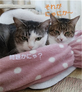 昨日はひな祭りということで、本当は、チャコとミランのツーショットをアップしたかったんですよね~そこで、ミランにお願いしたところ~と、西の横綱は、大きな欠伸をしながら、まったく私のお願いを聞いてくれません(-∀-`; )数年前に、ふたりのツーショットをちょいと加工して、お内裏様とお雛様としてアップしていました。また似たような加工をして、こちらにいらしてくださる方々に、長いお家時間の気晴らしに~と思ったのにぃ(´д`)仕方ないので、昨日はチャコがこの少し前、私のパソコンエリアの足元のホカペが気に入り、ゴロゴロしていたショットを載せました。しばらくすると、今度はしまホイに籠城。これも、ツーショット、と言えなくもないですが(^^:;それからまた、数時間後。何とか撮れたツーショットですが…もうアップしちゃったの!でも、ま、ひな祭りですからね。オヤツは差し上げますわ、適正量で(*≧ω≦)