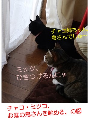 うふふ、ふたり揃ってお庭にきた鳥さんを眺めてますね。