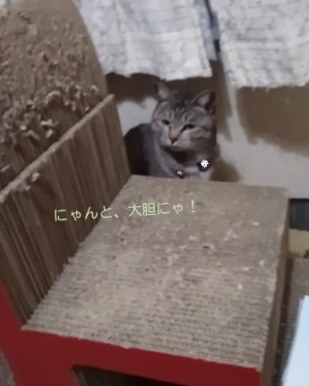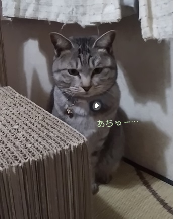 トイレ近くの爪とぎステップに隠れたとらぞーきゅんが、