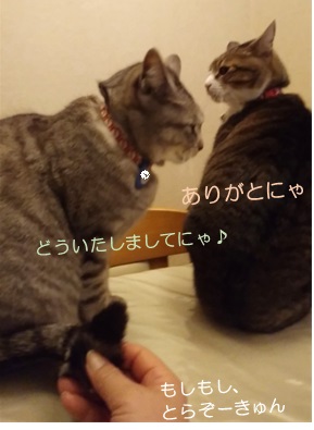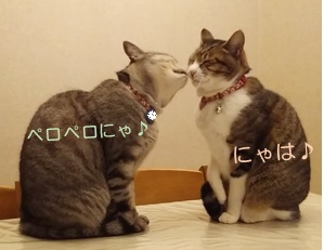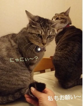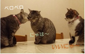例によって、エアコンをつけるとテーブルに集まる、母娘にゃん。