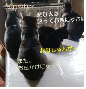 エアコンの当たる、テーブルの上に集う、4にゃんです。