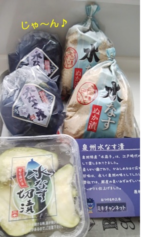 大きくて柔らかい水なすを3種類の味で、漬けてあります♪