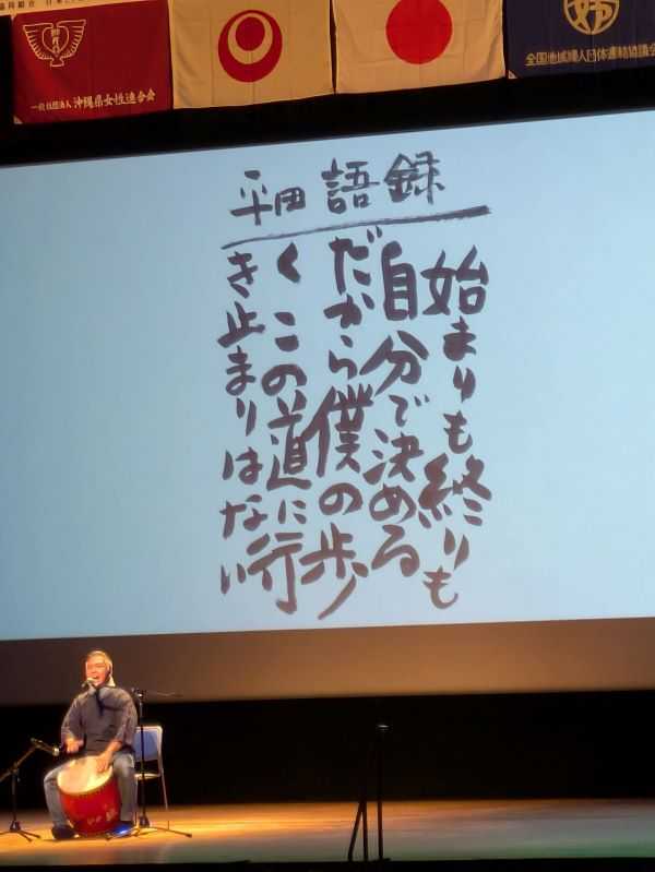 <ダイナミック琉球を太鼓だけで歌う平田大一さん>
