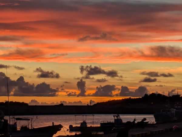 8月24日(日) 旧暦7月2日 六曜は「友引」 「夕焼け小焼け」って? 「夕焼け」はわかりますが「小焼け」の意味ってなんでしたっけ。 調べてみると「夕焼け」に対して調子を整える言葉 「仲良し子よし」 「ほうほう蛍」 「ちんちん千鳥」 などのように唄(俳句や短歌のような童謡の世界とか)の世界では、調子を整える言葉として使われているようです。 また、科学的には 太陽が沈むとき空が真っ赤に染まる現象を「夕焼け」 沈んだ太陽に照らされた空がもう一度赤くなる現象を「小焼け」 と言うんだそうです。 ちなみに夕焼けが赤いのは、太陽が地平線に近づくため、太陽光は大気中を斜めに、より長い距離を通過するため、波長の短い青い光は散乱し、波長の長い赤い光だけが人の目に届くので、夕日が赤く見えるのだそうです。 <波長の長い赤だけが残って、太陽が沈んでも赤い夕焼けが見える> 目に見えないのですけど、太陽の光の中には色々な波長の色が混ざっていて、その混ざり方で人の見る色が変化してきて、大気中の通過時間で変わってくるということでしょうか。当たり前に思う現象も科学的理論がちゃんとあって、面白いものです。 日没後30分くらい後でも、茜色がたなびいていて、1時間くらいでも、うっすらと赤みが残ります。波長の長い赤ってすごい。まさに最強です。 考えてみると「赤」は元気パワーと言われ、還暦を迎えると「赤ん坊に戻る」の意味や、魔除け厄除けの意味からも「赤のパワー」を使います。 私は古希をとっくに過ぎて「紫色」ですが、「赤パン」を勝負着の一つにしていますし、マイカラーとして使っています。 (何しろ「紫」は一番波長が短いらしいので、真っ先に消えちゃうじゃないですか、古希の色に使うなよ) でも「夕焼け小焼け」は「沈む(消えゆく)」流れではなく、太陽光が最強パワーを送ってくれていると思うと、なんだか力が湧いてきます。いつもの単純思考ですけどね。 今日はね、 久しぶりに「久米島観光大使」の大久保さんにお会いしました。 個人的な用ではなく、女性会の来月開催される「久米島ファンクラブ15周年記念」に向けての打ち合わせに同席させてもらっただけですが、お元気そうで良かったです。 奥様がご一緒じゃなかったのが残念でしたが、すでに70回の来島記録を持つお二人ですし、すぐにまた来られるでしょう。 最近「久米島ファンクラブ」の会員の方は、来島なさった時「ただいま」とおっしゃる方が多いですが、このご夫妻は「ただいま」を言える筆頭です。 「お帰りなさい」皆様。 久米島の美しい夕焼けも、た~くさん見て行ってくださいね。 ※太陽光は実際には、赤、橙、黄、緑、青、藍、紫と言った様々な光が混ざり合ってできていて、これらが合わさると白っぽく見えるそうです。これらの色は波長(光の波の長さ)が異なり、紫や青は波長が短く、赤は波長が長いという事です 。
