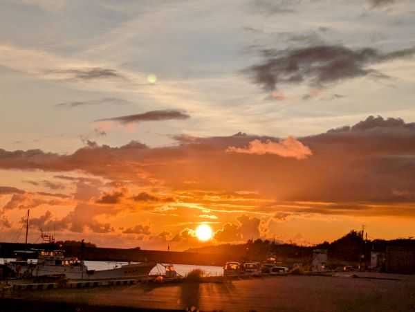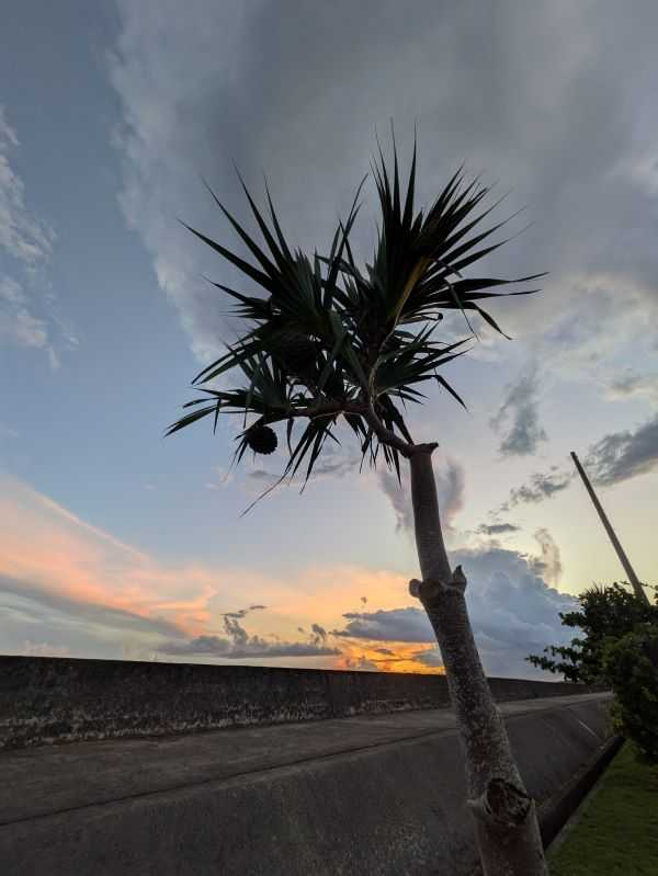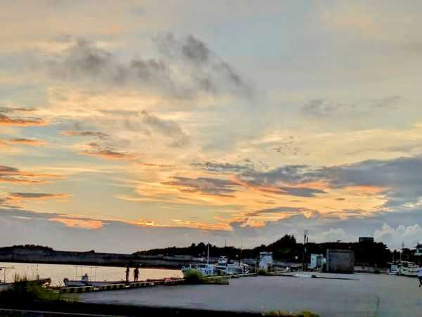 8月27日(水)旧暦7月5日 六曜は「大安」 家事ウォークと公園のウォーキングを合わせて、昨日は「6297歩」と「5000歩」をクリア。 ウォーキングは、日没に合わせて夕方6時半過ぎには出ていきます。 公園で出迎えてくれるのは、海の香りや芝生の草の香り、夕暮れ時の鳥たちの鳴き声、海風で大木にはなれないけれど、デイゴやガジュマルやヤシの木、そして雨が降っても曇っても、大きな空と海たちです。 <夕暮れのカタブイ雲、時折り空を覗かせながら> <港は静かに明日を待つ> <フクギの実は落ちて> 少し雨に濡れた1周道を、ランナーさんに追い越されながら、チラチラ降る霧雨の中を歩きます。 いつの間にか降り出して、いつの間にか消え去る小さなカタブイ雨でした。それでも小さカタブイの感触は気持ち良く、身体のほてりを静めてくれるような感じでした。 カタブイは実は好きなんです。 予期せぬ雨で洗濯物被害にあったりもしますけど、雨の切れ目が見えたり、降っている降っていないで、道路がはっきりと線引きされる事も、雨に追っかけられたりもして、とかく面白い遊び雨だと思っています。 でも昨日のカタブイは、少し人生をしみじみとさせる霧雨でした。 ※カタブイ(片降い): 「あっちは晴れているのに、ここだけ雨降ってるよ」の時、カタブイしてると言います。