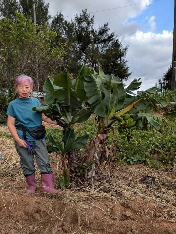 8月25日(月) 旧暦7月3日 六曜は「先負」 時間がありすぎるというのも、ちと困りもです。 その日のやることも決めていないので、特に用事がなければお昼寝までしちゃうという日々。 そろそろ腰痛も治まってきました。 書くこともしつこくなってきましたので、簡潔にまとめる癖をつけたいものです。 今は閉鎖中の農園の、最初のとっかかりはバナナでした。 私のひい婆ちゃんゃんちの台所の脇にバナナの木が植わっていて、いつもバナナが実っていました。今思えば小さな私の手でも下側のバナナが触れるくらいでしたから、背の高い島バナナではなくサンジャクーだったかもしれません。 それが私のバナナへの愛着の始めでした。 バナナ農園のスタートから、だんだんほかの南国フルーツにも興味が移り、今の農園になりました。 年を取りますとね、バナナの重さが辛くなり、電信柱のような幹を切り倒すのも辛くなり、バナナを少しづつ減らしていったのです。 バナナが縁で農業仲間もでき、趣味でバナナを作っているオーさんもそんな一人でした。20数年来の付き合いになります。 ある時、世界の小さなバナナを探していると言う東京の方からお電話いただき、オーさんと一緒に探し始めました。 私たちの考えでは、小さいバナナは島固有のバナナではなく、誰かが島に持ち込んだものが、あちらこちらに散っただけだと思っています。 かって、島に小さなバナナがあったと聞いた事はありませんでしたし、小さいバナナを見かけだしたのはここ20年くらいです。 ですが万が一と思い、オーさんと一緒に探し始めました。 ミニを訪ねて何軒か比べながら、できるだけ丈の小さなバナナを探して歩きました。152㎝の私の身長で高さを見ながら。 こちらのバナナは、実もしっかりついて、少しだけ畑の隅に残っていました。ミニバナナの畑として作った事は聞いていましたが、農園主が亡くなり、いつの間にかバナナも消え消えになって、畑を借り受けた方はバナナの名前を知りませんでした。 しばらくしてこれよりもっと小さなバナナを見つけました。オーさんと出かけ、実もしっかりついているのも確認できました。 すぐにお宅に伺ったのですが、もらって植えただけで名前もわからないとの事でした。 <一番背の高いバナナも私の背丈を越せません、実がちゃんとついています> 低い場所で実がなっているこちらのバナナは、途中で茎をカットしたので、途中からバナナの実が出てきたようです。このくらいのミニが探せると嬉しいのですが・・・。 でも先のバナナと同じ種類のようにも見受けられます。地力の関係もありますからね。色々探しましたが、これ以上小さいのが見つからず、この辺が限度かな思っていました。 ところが、これらの半分の高さのバナナが植わっているお宅がありました。実は前から気づいてはいたのですが、小苗かと思い観察していました。 もしかして園芸種のバナナで、私たちの思うバナナから外れているのかもしれないので、スルーしていたのです。 今も一向に大きくならず、花の種類に入る園芸用かなと思いはするのですが、とりあえず近々行ってみようという事にしてありました。 残念ながら、先日突然オーさんが亡くなられたので、今このバナナを訪ねてはいません。 たくさんのバナナを訪ねましたが、ほとんどが外来で、島固有のものはありませんでした。 島バナナは昔から誰でも知っているバナナんなんですが、今はアップルバナナとかアイスクリームバナナとか野菜バナナや銀バナナとか、正式名称を知らずに入っているものが多く、困りものではあります。 ただ、台風対策に、前出の小ぶりバナナを入れた人たちも結構いるようです。 その多くが、外から入ったバナナたちです。 今、島のバナナは多種多様化していて、そのうち混血が生まれるかもしれません。 島で一番小さいバナナを所有している方がおられたら、そのバナナの名前を教えて下さいませんか。 オーさんのご法要が終わりましたら、かのお宅を訪ねてみようと思っています。
