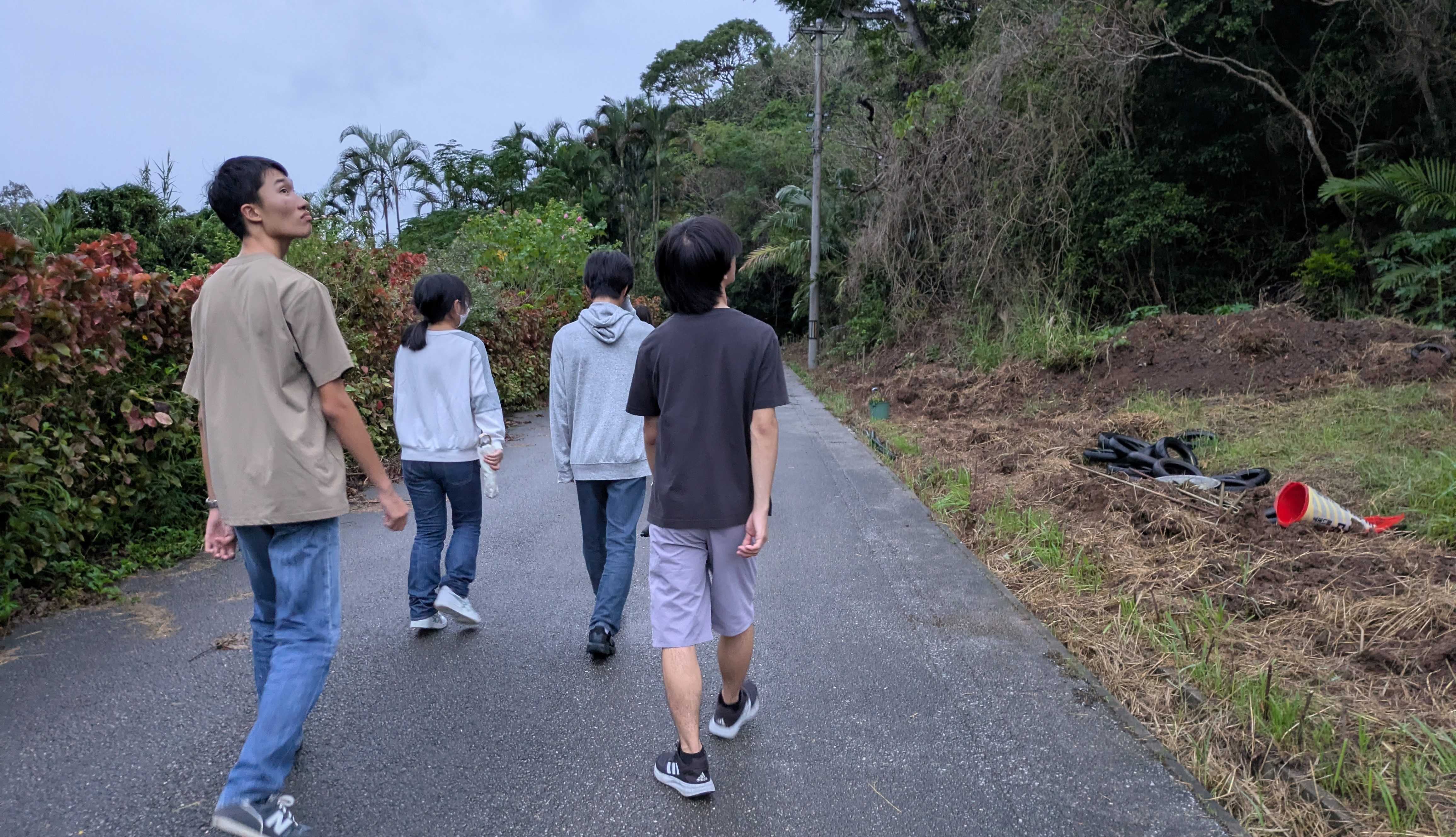 10月14日(火) 旧暦8月23日 六曜は「赤口」 昼寝をしているせいで、夜が寝付けず、昨夜も4時ごろまで起きてしまい、今朝はいつもより1時間余りも遅く起きてしまいました。 午前中で掃除と、買い忘れた食材を買いに出かけ、ちょうどお昼時、子供たちを迎える準備が整いました。 今日と明日は、遅くの日記アップになりそうです。 今日の子供たちと何をしたかと言うとですね。 ただの散歩です。 海を見たり、ホタル館を訪ねたり、商店街を歩いたりしながら、ぶらぶらと散歩に出かけました。 <道路際で実るバナナとか> <なぜだか干からびて死んでしまったハブの子とビーチャーの子とか> <道端でけなげに咲くタマスダレと秋の忘れ草とか> 牛やヤギや、群れ飛ぶ鳩たち(誰かが飼っているらしい綺麗な鳩たちの群れでした)などを見ながら高台まで歩き、曇るお天気で海の青さは出ないのに、水平線を見て喜ぶ子達と、私も1万歩を歩いてしまいました。 そんな散歩で喜ぶ子供たちはとても新鮮で、いつもはきつい坂道だってすたすた歩けてしまいましたよ。 私はお夕飯を作ってあげただけですけどね。彼らはチビチビと遊んでくれ、男の子たちは、鴨居が落ちて、はめ込むことができずにいた我が家の障子もはめてくれました。 さすが男の子が4人もいれば、鴨居も支えられます。 そして最後は、ちょっと趣向を凝らして集合写真を1枚。 <はい ポーズ! > 本日のホームビジットも、素直でいい子達ばかりでした。