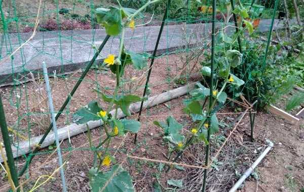 農園のキュウリは、風にもまれた葉を切り落とし、負担がかからないようにしました。花は次々と咲いているのですが、実が出来ますかどうか。