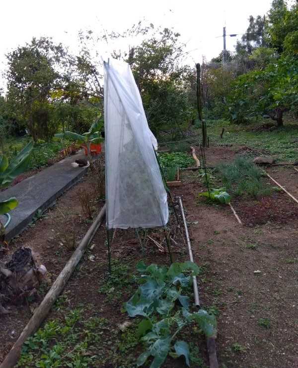 カリフラワーは、風にさらされながらも何とか頑張ってくれていますが、ダメージの大きいキュウリは試しに不織布をかけてみました。狭いけれど何とかこの中で育ってくれると良いのですが。
