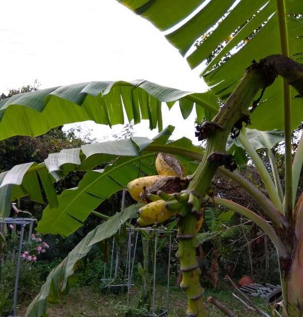 冬バナナは、甘みが薄くあまり美味しいとは言えません。しかし今回バナナをほとんど処分しましたので、農園には4本しか実っていません。みんなカラスの餌食にするわけにはいきませんしね。