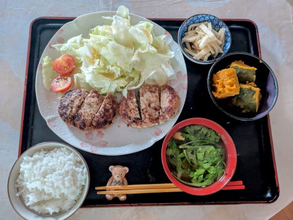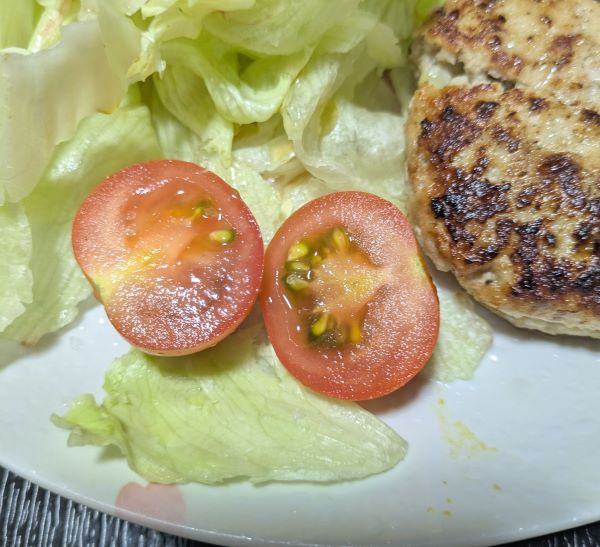 お昼はまだ残っていたハンバーグを2個、朝もぎのトマトを添えて頂きました。「ダイエットをしているような食事じゃないわね」と思いながらも完食です